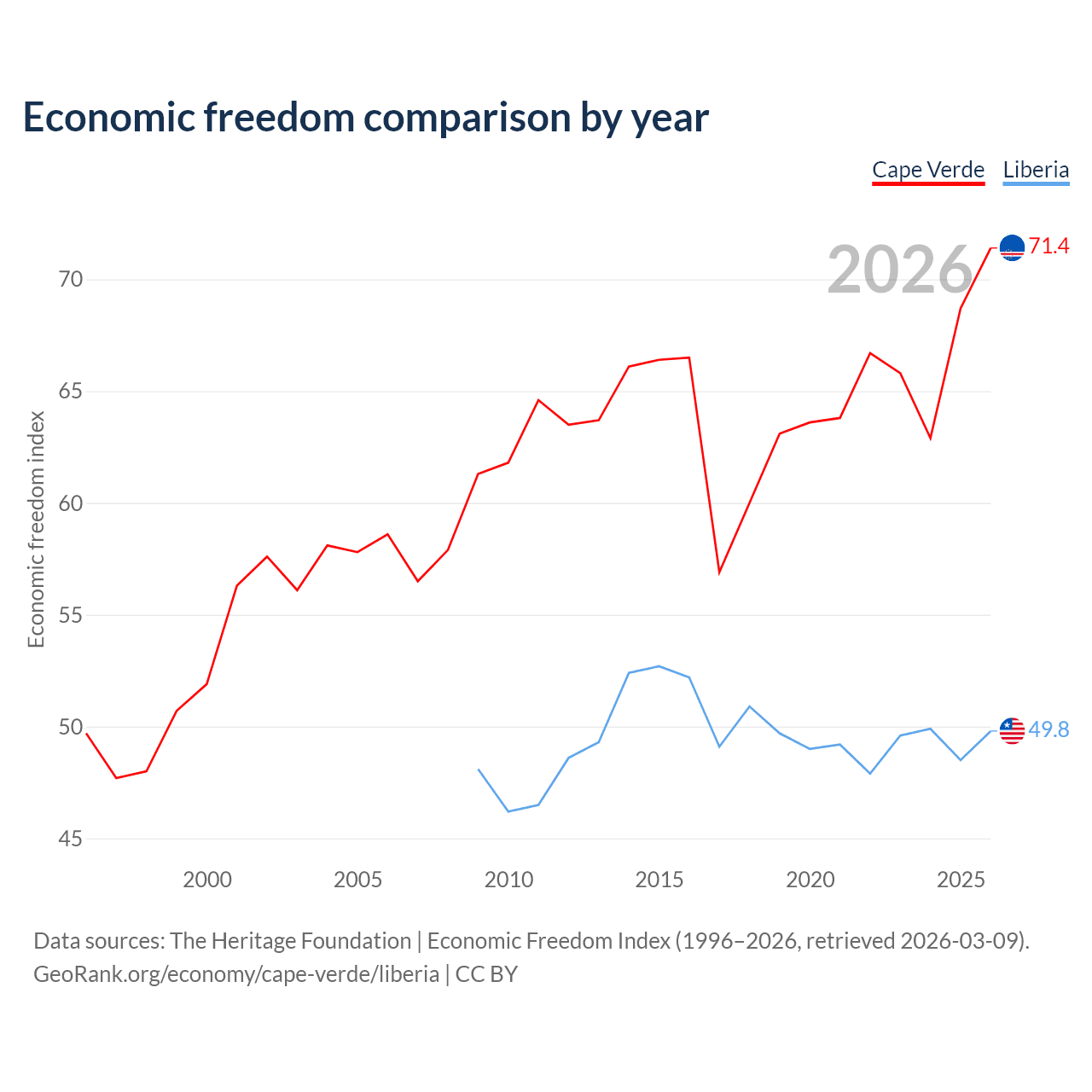 The Economic Freedom Index for Cape Verde is 71.4, ranking 32/197, compared to 49.8 for Liberia, ranking 163/197. The chart above displays a comparison of annual changes in economic freedom indexes.