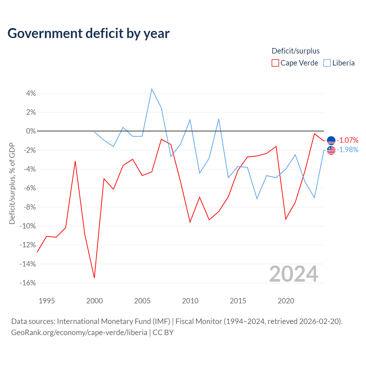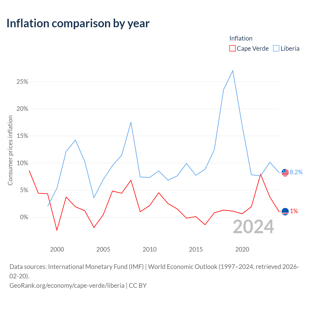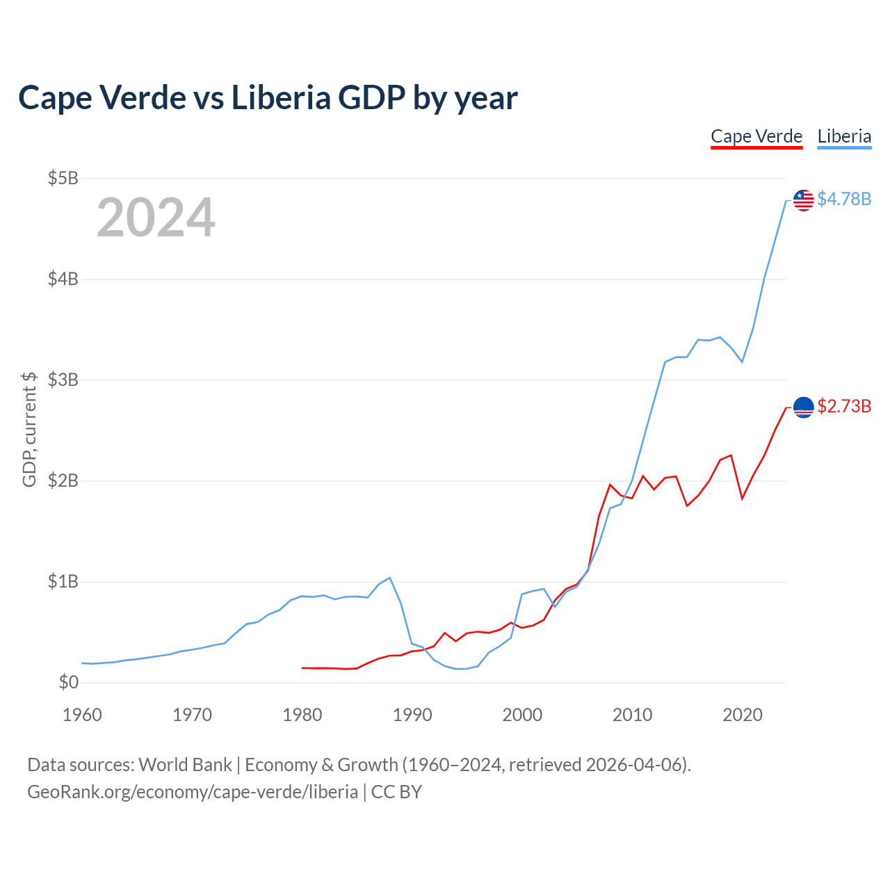 Cape Verde has a GDP of $2.73B compared to $4.78B for Liberia, ranking 172/197 and 163/197 by economy size, respectively.