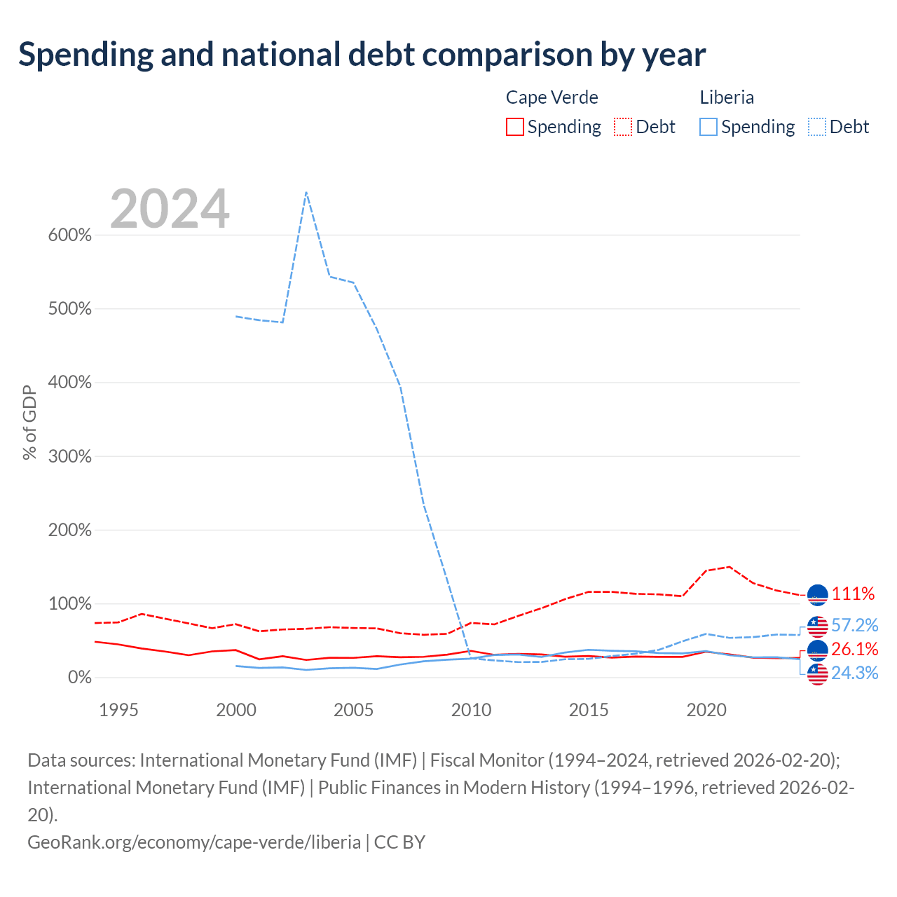 Cape Verde has $3.03B in government debt (111.2% of GDP), compared to $2.73B (57.2% of GDP) in Liberia.