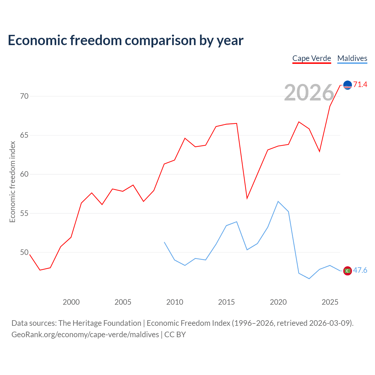 The Economic Freedom Index for Cape Verde is 71.4, ranking 32/197, compared to 47.6 for Maldives, ranking 174/197. The chart above displays a comparison of annual changes in economic freedom indexes.