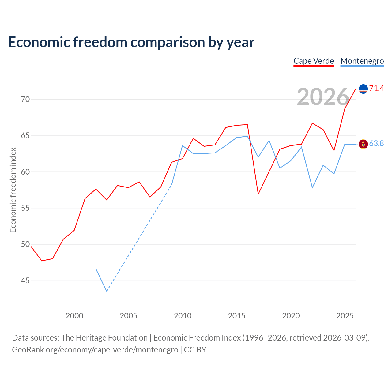 The Economic Freedom Index for Cape Verde is 71.4, ranking 32/197, compared to 63.8 for Montenegro, ranking 78/197. The chart above displays a comparison of annual changes in economic freedom indexes.