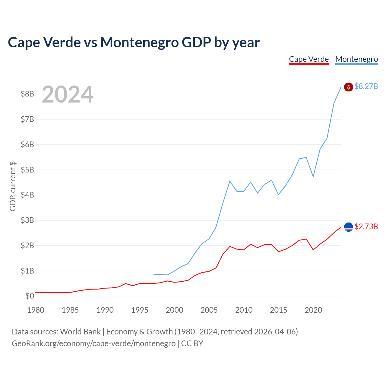 Cape Verde has a GDP of $2.73B compared to $8.27B for Montenegro, ranking 172/197 and 155/197 by economy size, respectively.