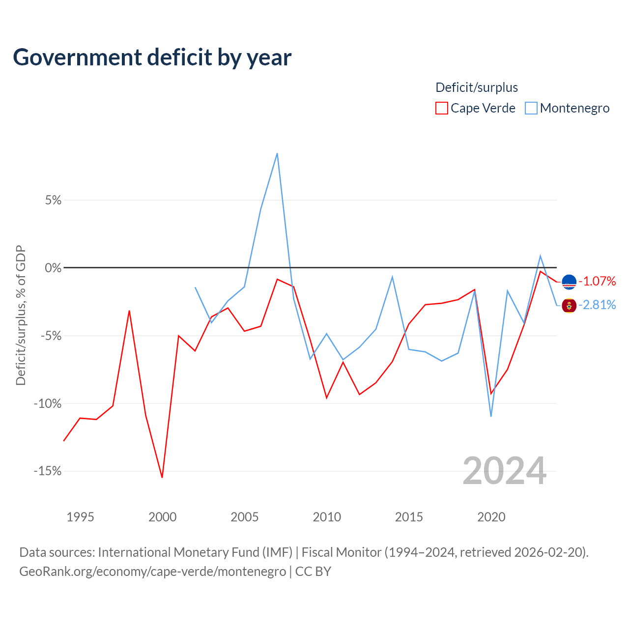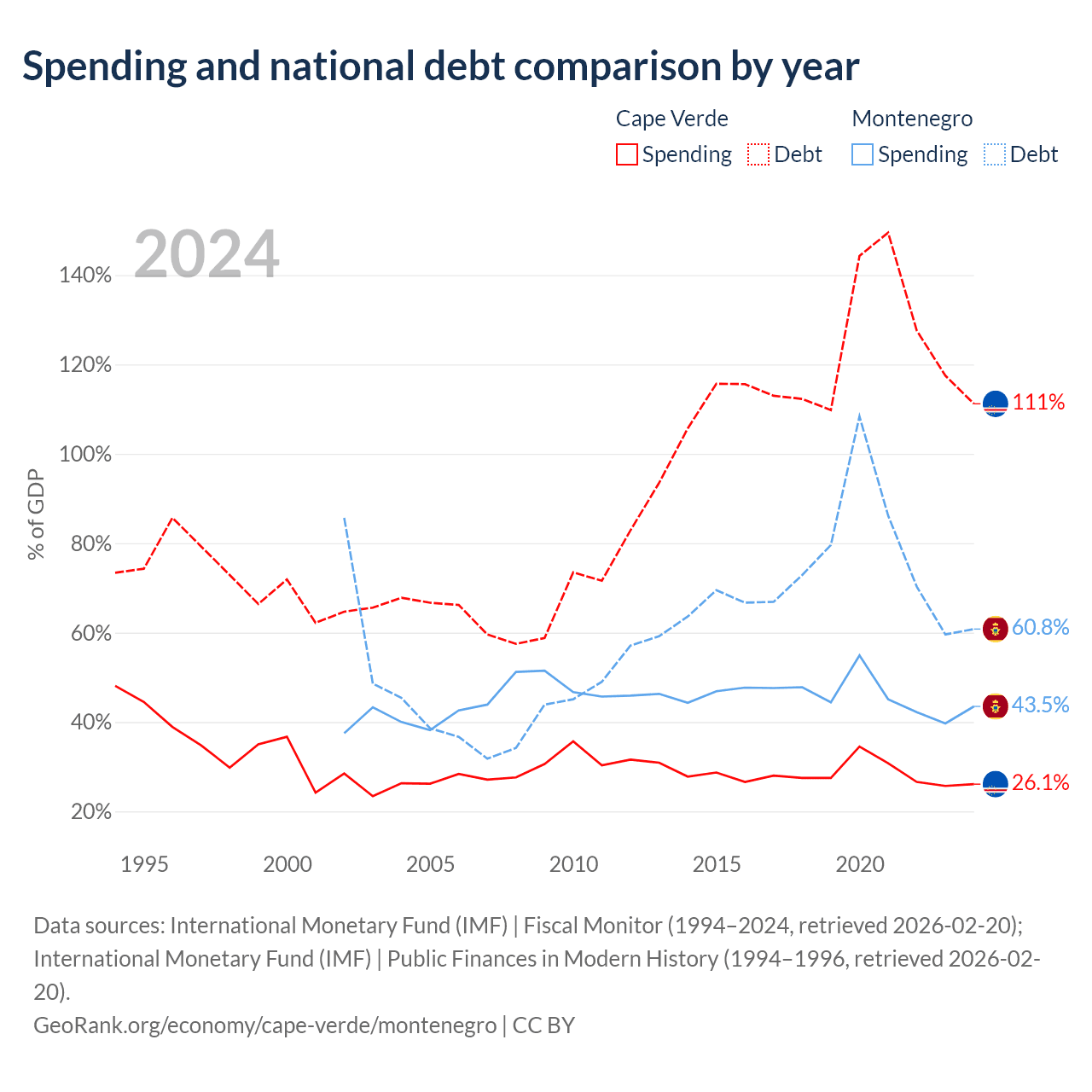 Cape Verde has $3.03B in government debt (111.2% of GDP), compared to $5.02B (60.8% of GDP) in Montenegro.