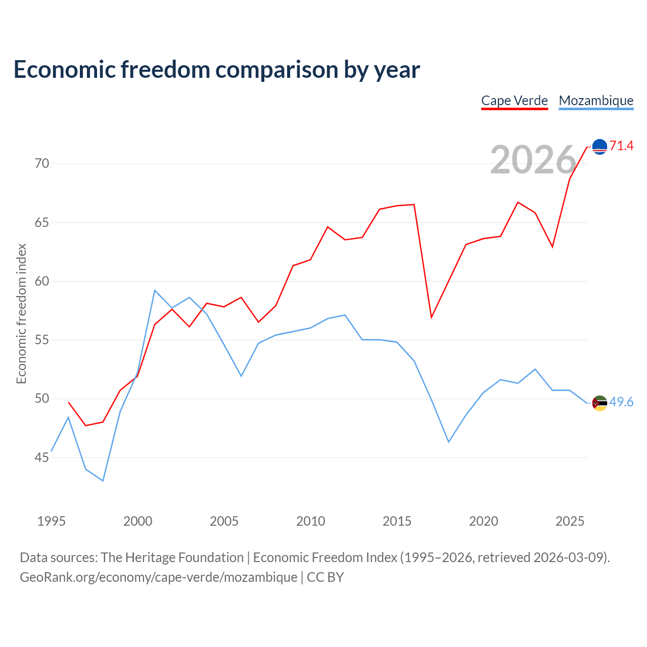The Economic Freedom Index for Cape Verde is 71.4, ranking 32/197, compared to 49.6 for Mozambique, ranking 164/197. The chart above displays a comparison of annual changes in economic freedom indexes.