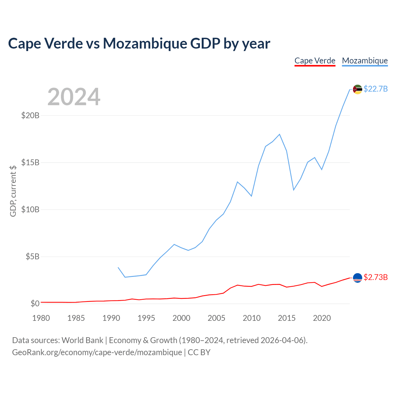 Cape Verde has a GDP of $2.73B compared to $22.7B for Mozambique, ranking 172/197 and 123/197 by economy size, respectively.