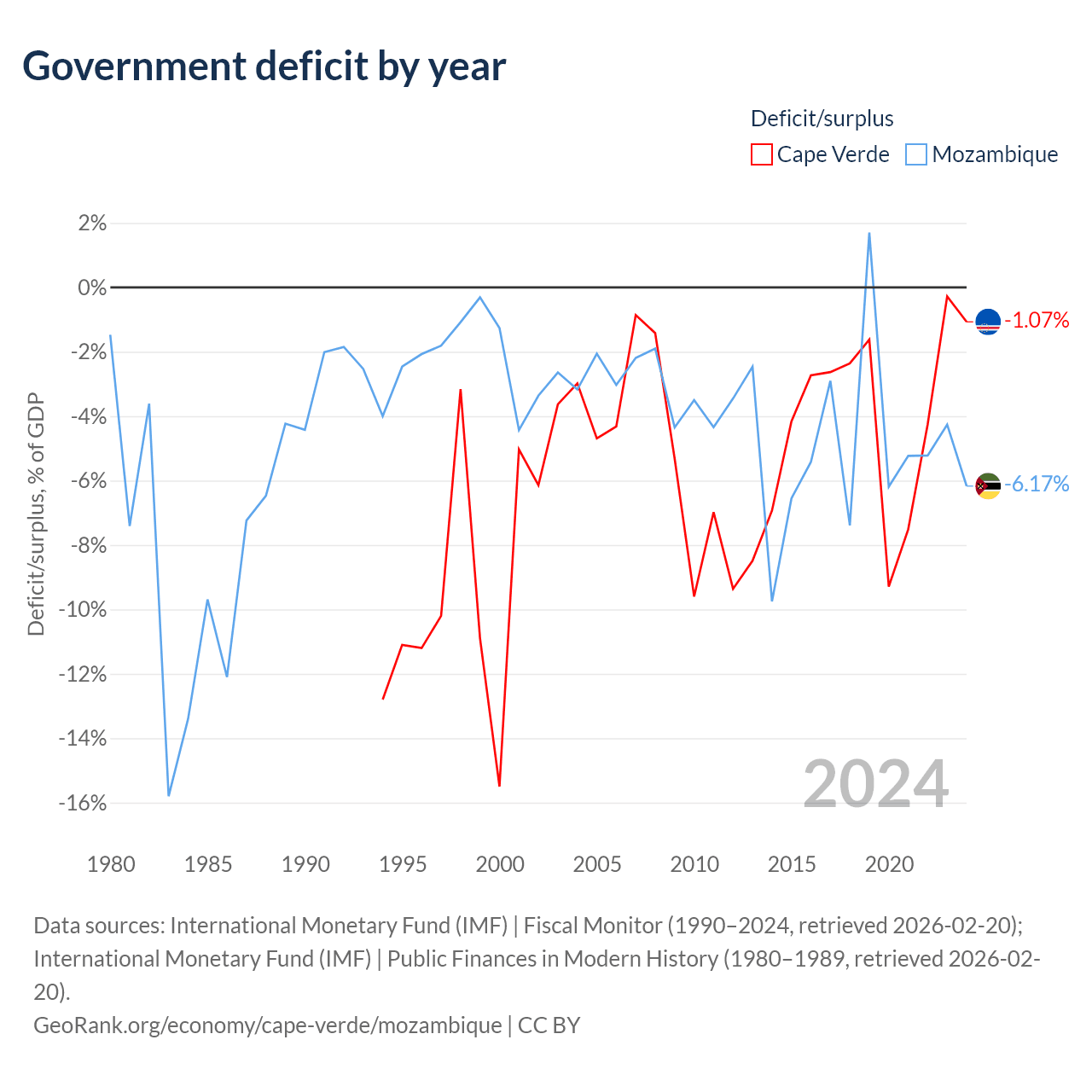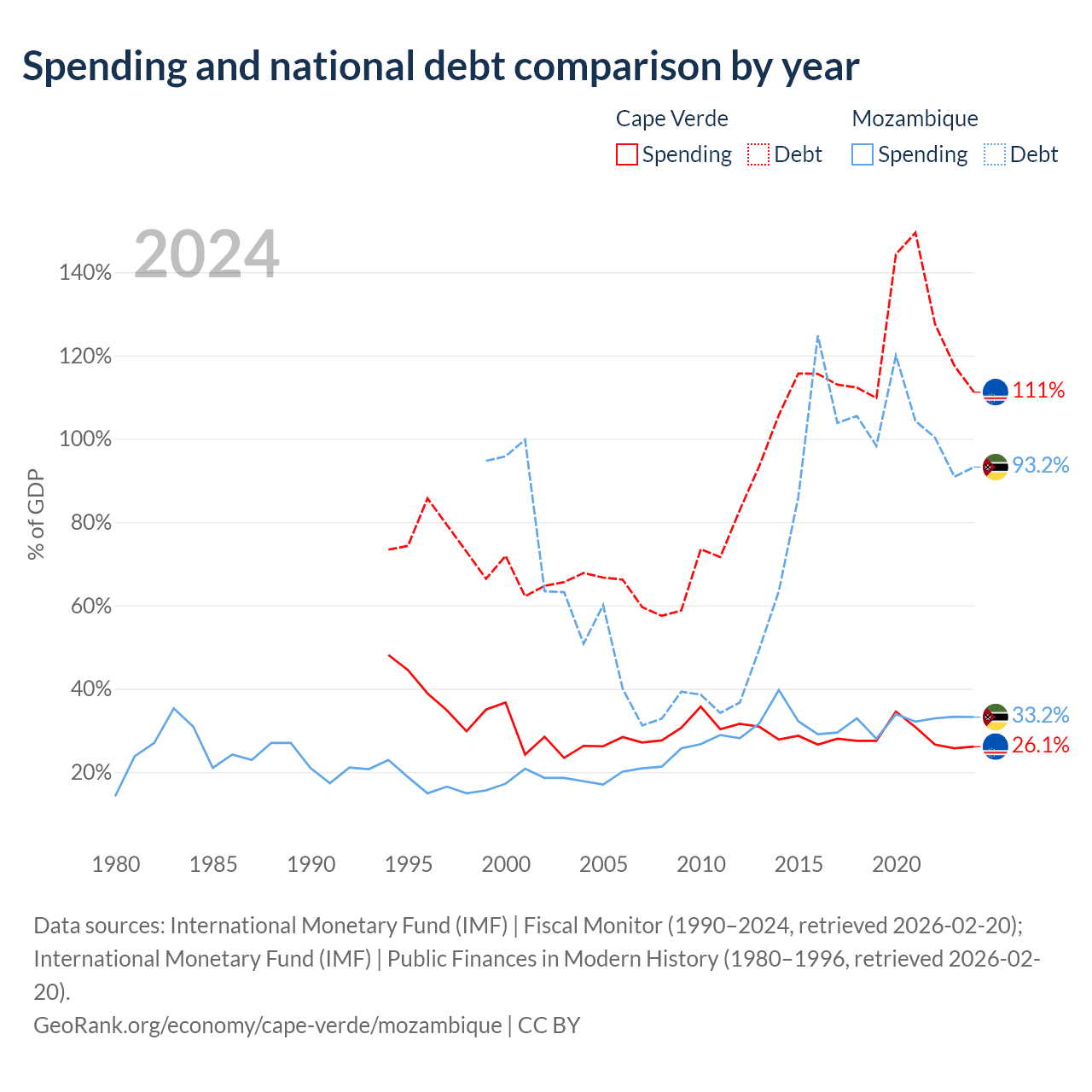 Cape Verde has $3.03B in government debt (111.2% of GDP), compared to $21.2B (93.2% of GDP) in Mozambique.