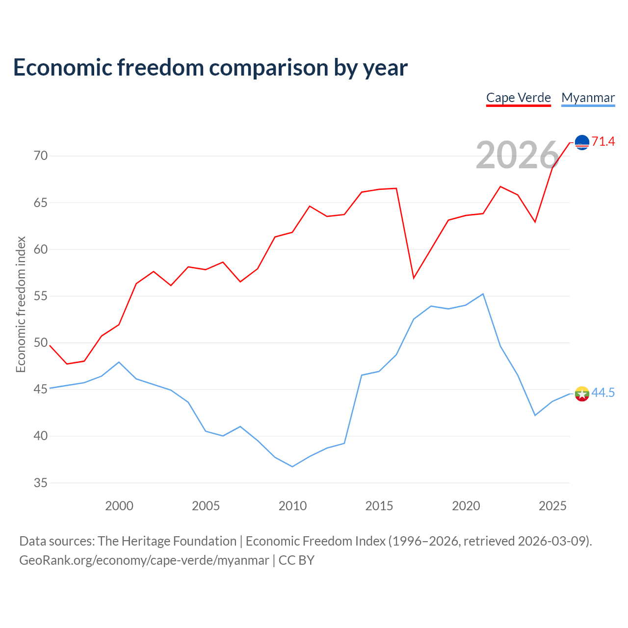 The Economic Freedom Index for Cape Verde is 71.4, ranking 32/197, compared to 44.5 for Myanmar, ranking 180/197. The chart above displays a comparison of annual changes in economic freedom indexes.