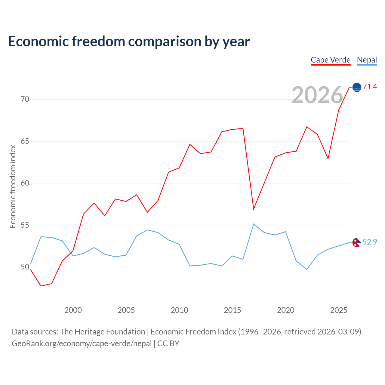 The Economic Freedom Index for Cape Verde is 71.4, ranking 32/197, compared to 52.9 for Nepal, ranking 144/197. The chart above displays a comparison of annual changes in economic freedom indexes.