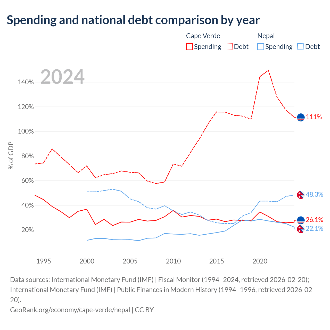 Cape Verde has $3.03B in government debt (111.2% of GDP), compared to $20.7B (48.3% of GDP) in Nepal.