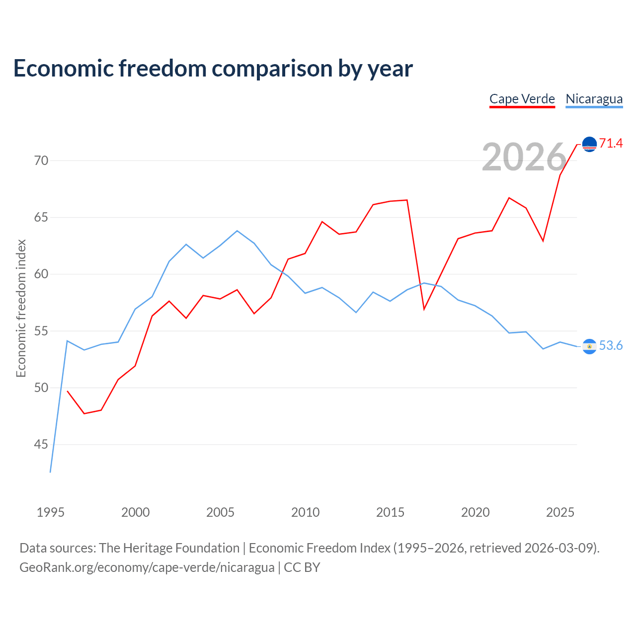 The Economic Freedom Index for Cape Verde is 71.4, ranking 32/197, compared to 53.6 for Nicaragua, ranking 139/197. The chart above displays a comparison of annual changes in economic freedom indexes.