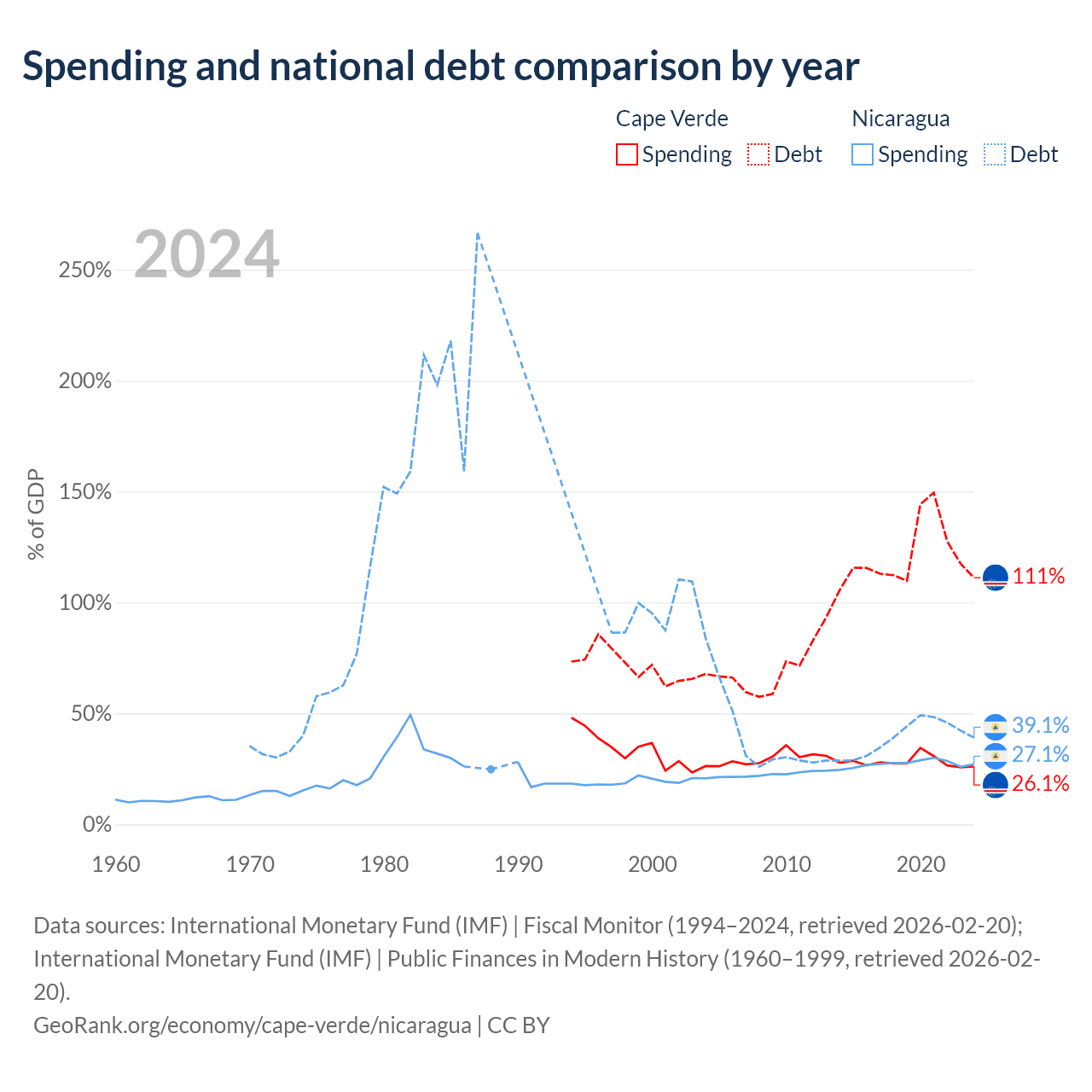 Cape Verde has $3.03B in government debt (111.2% of GDP), compared to $7.71B (39.1% of GDP) in Nicaragua.