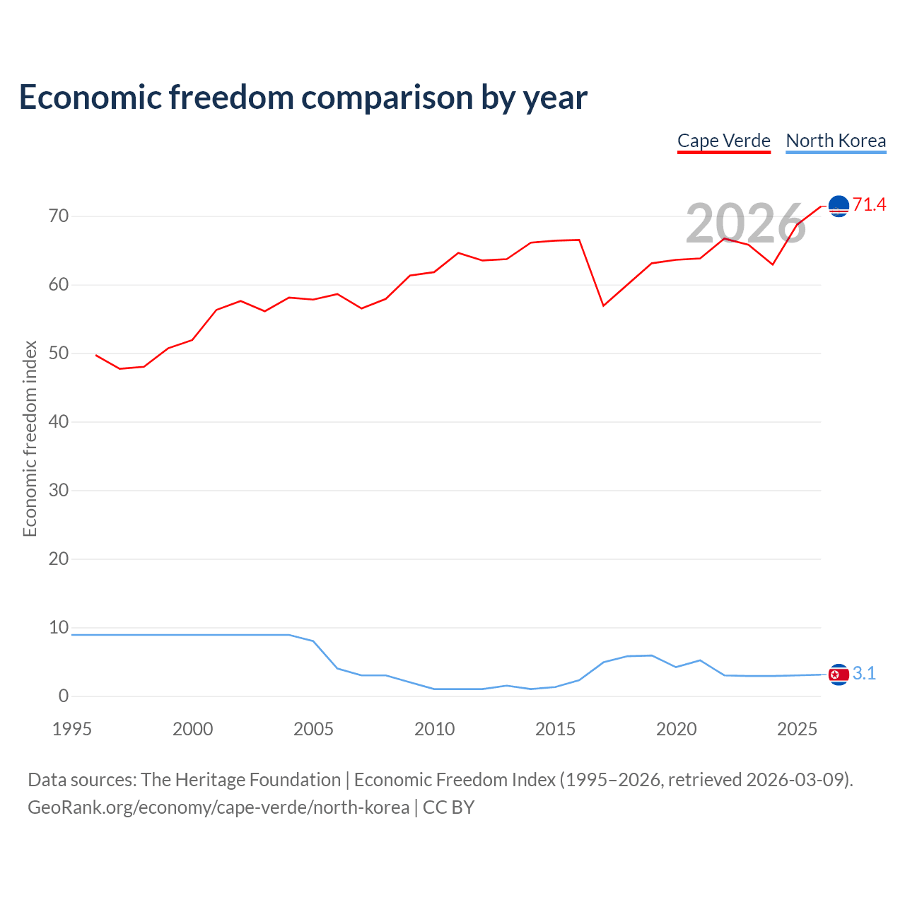 The Economic Freedom Index for Cape Verde is 71.4, ranking 32/197, compared to 3.1 for North Korea, ranking 197/197. The chart above displays a comparison of annual changes in economic freedom indexes.