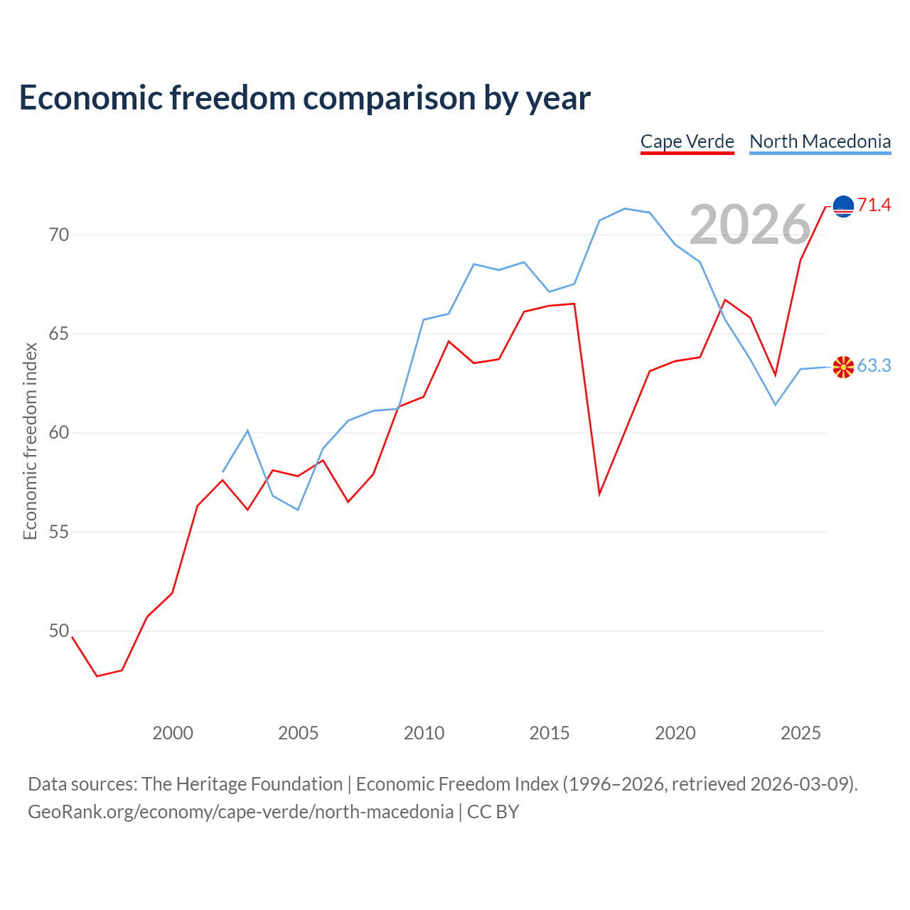 The Economic Freedom Index for Cape Verde is 71.4, ranking 32/197, compared to 63.3 for North Macedonia, ranking 81/197. The chart above displays a comparison of annual changes in economic freedom indexes.