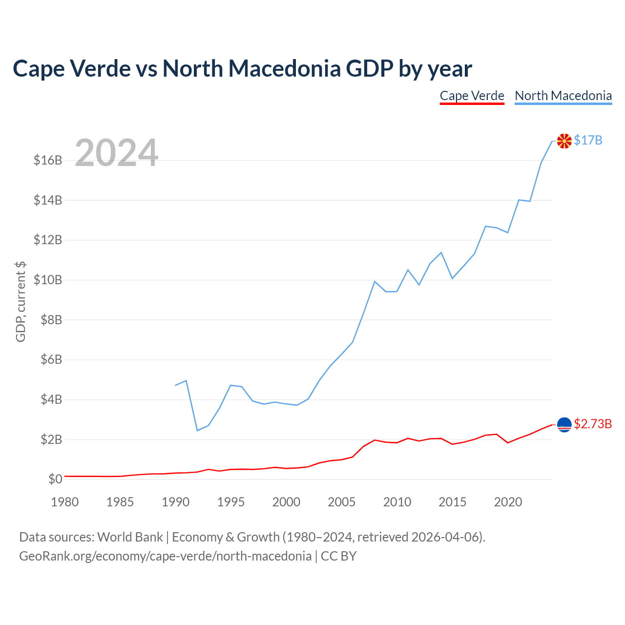 Cape Verde has a GDP of $2.73B compared to $17B for North Macedonia, ranking 172/197 and 138/197 by economy size, respectively.