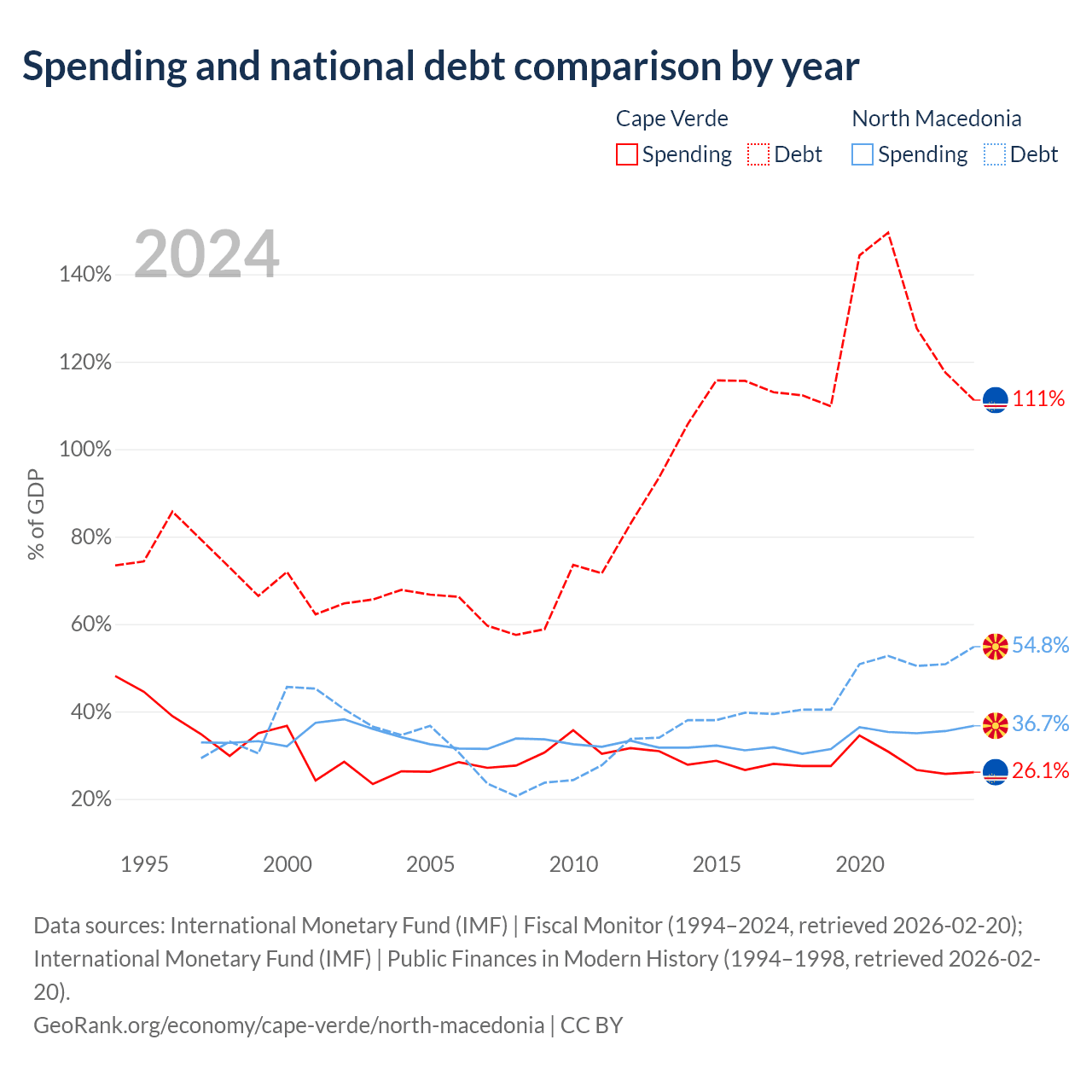 Cape Verde has $3.03B in government debt (111.2% of GDP), compared to $9.3B (54.8% of GDP) in North Macedonia.