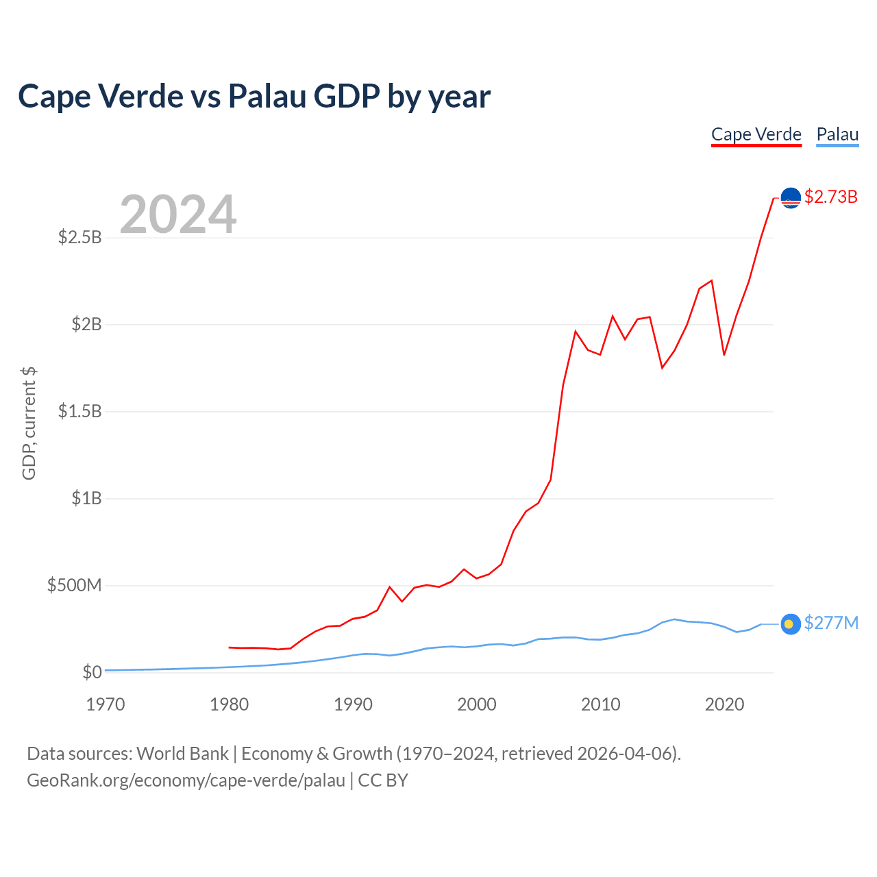 Cape Verde has a GDP of $2.73B compared to $277M for Palau, ranking 172/197 and 194/197 by economy size, respectively.