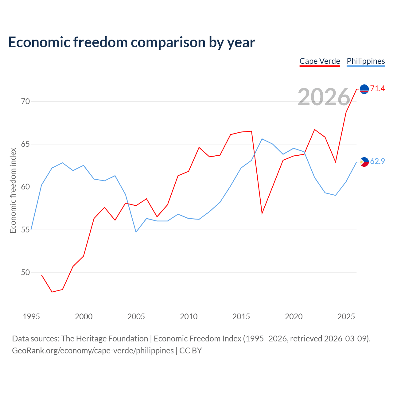 The Economic Freedom Index for Cape Verde is 71.4, ranking 32/197, compared to 62.9 for the Philippines, ranking 85/197. The chart above displays a comparison of annual changes in economic freedom indexes.