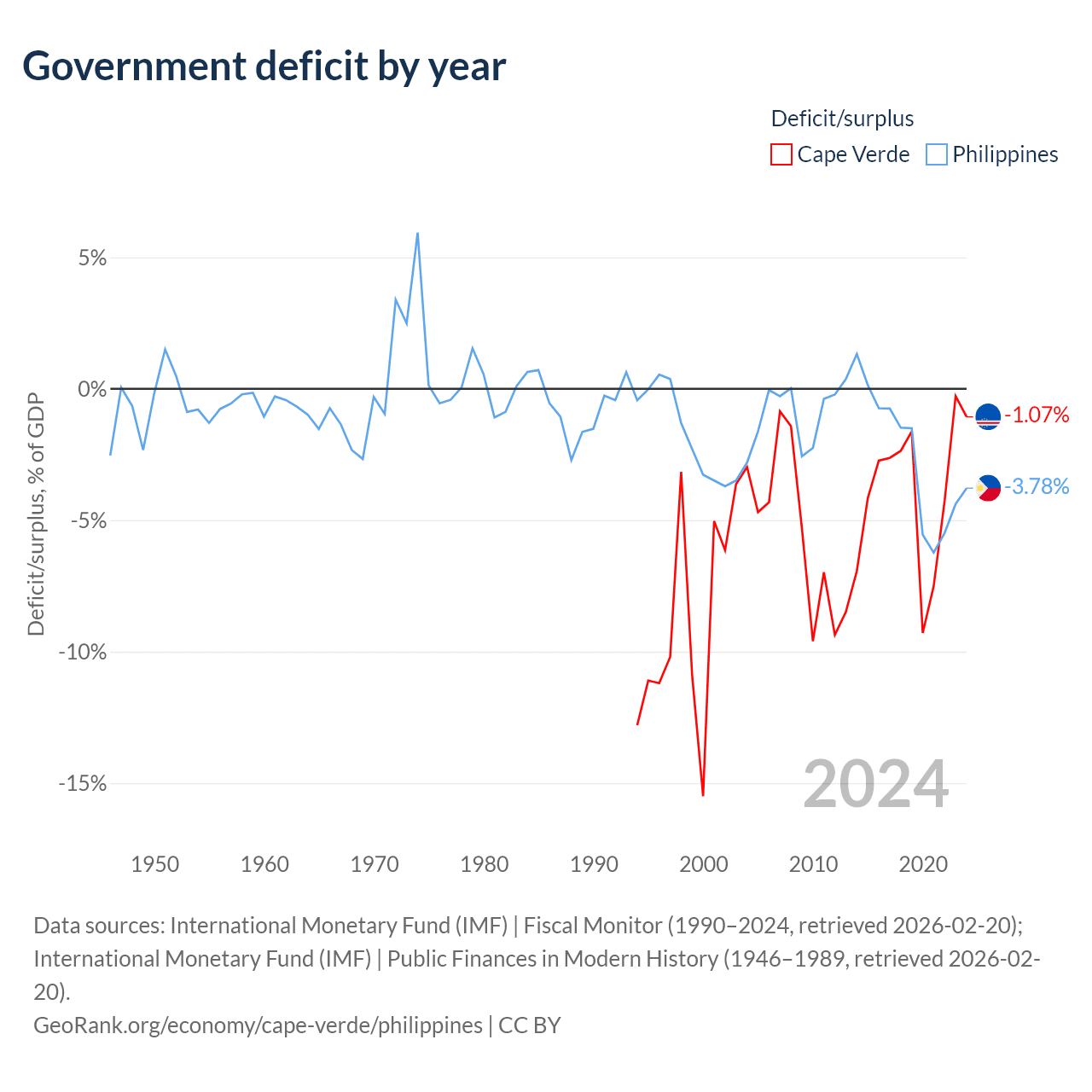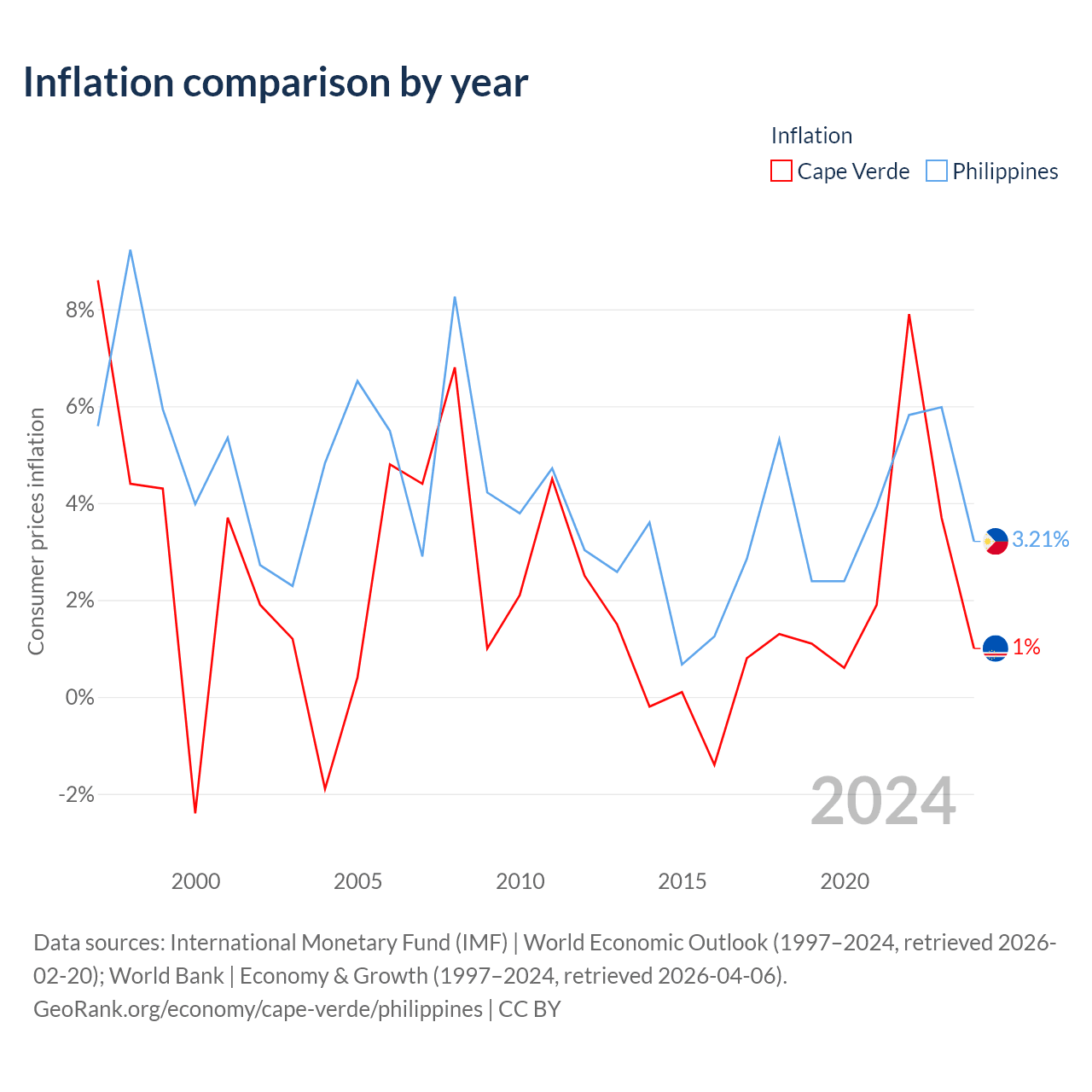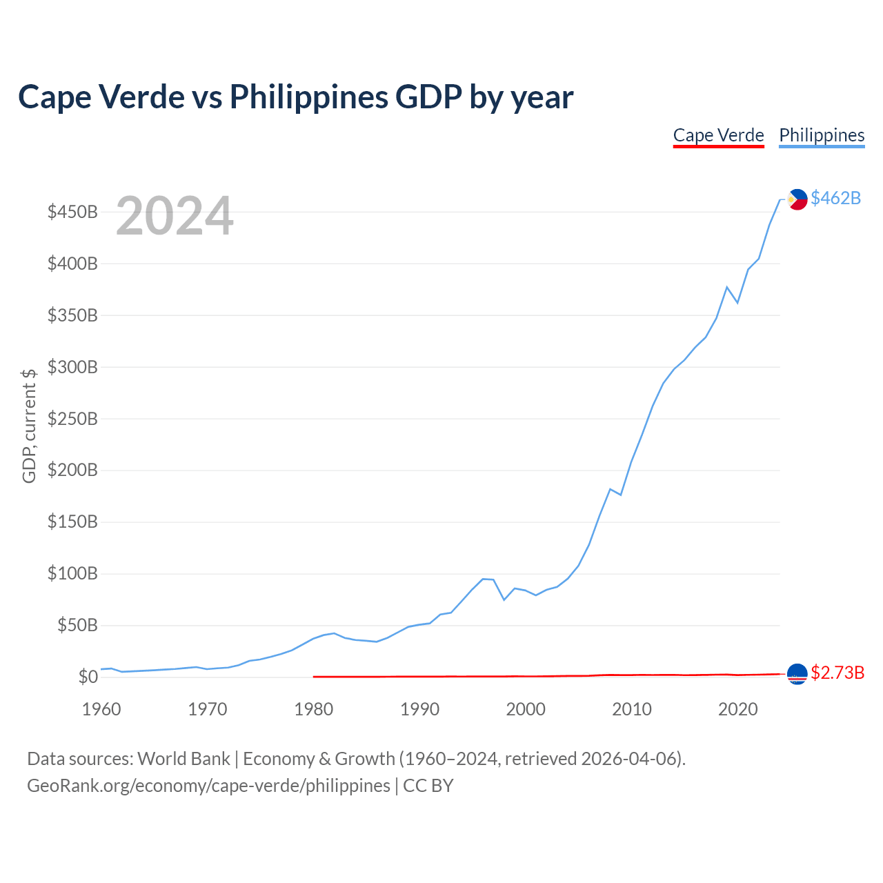 Cape Verde has a GDP of $2.73B compared to $462B for the Philippines, ranking 172/197 and 35/197 by economy size, respectively.