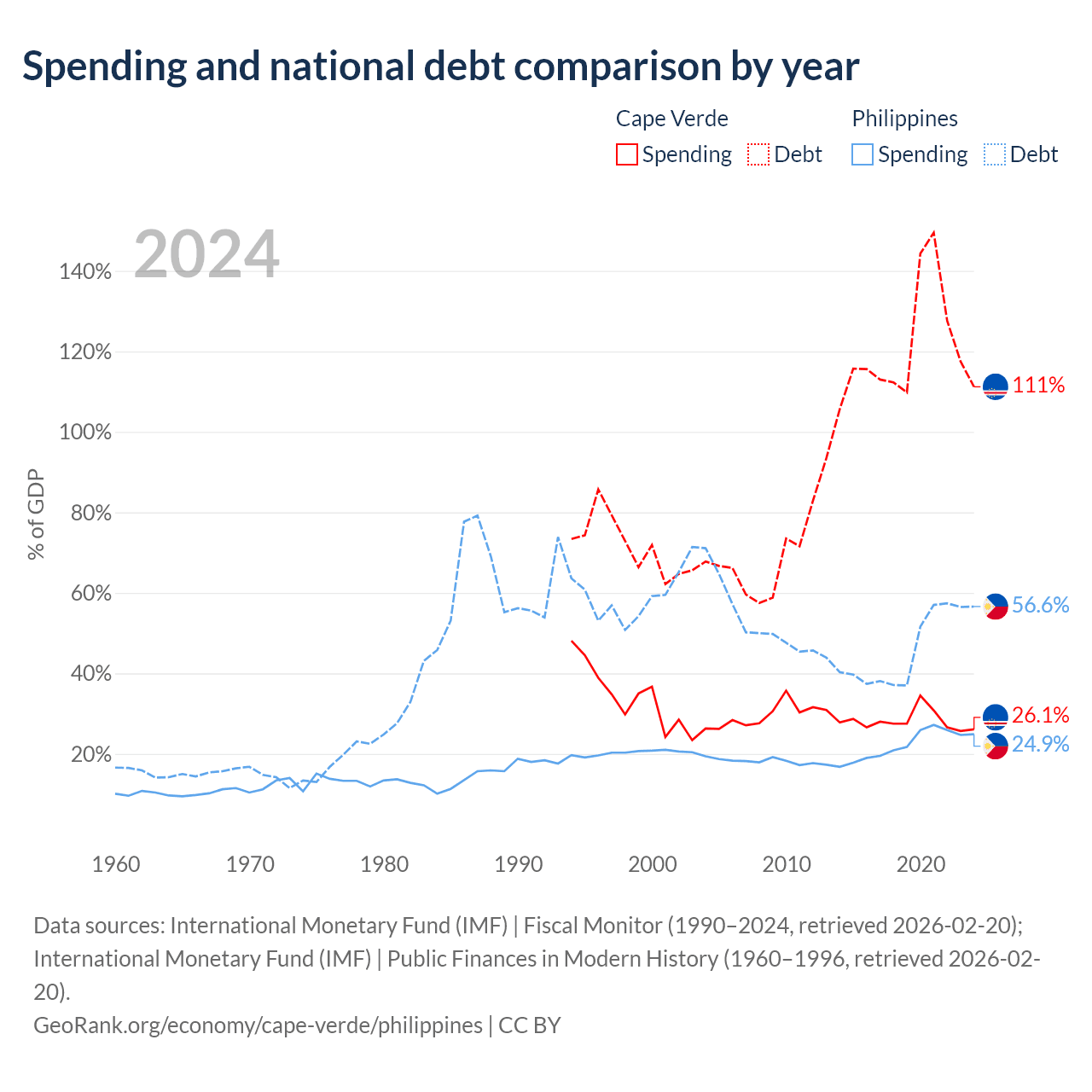 Cape Verde has $3.03B in government debt (111.2% of GDP), compared to $261B (56.6% of GDP) in the Philippines.