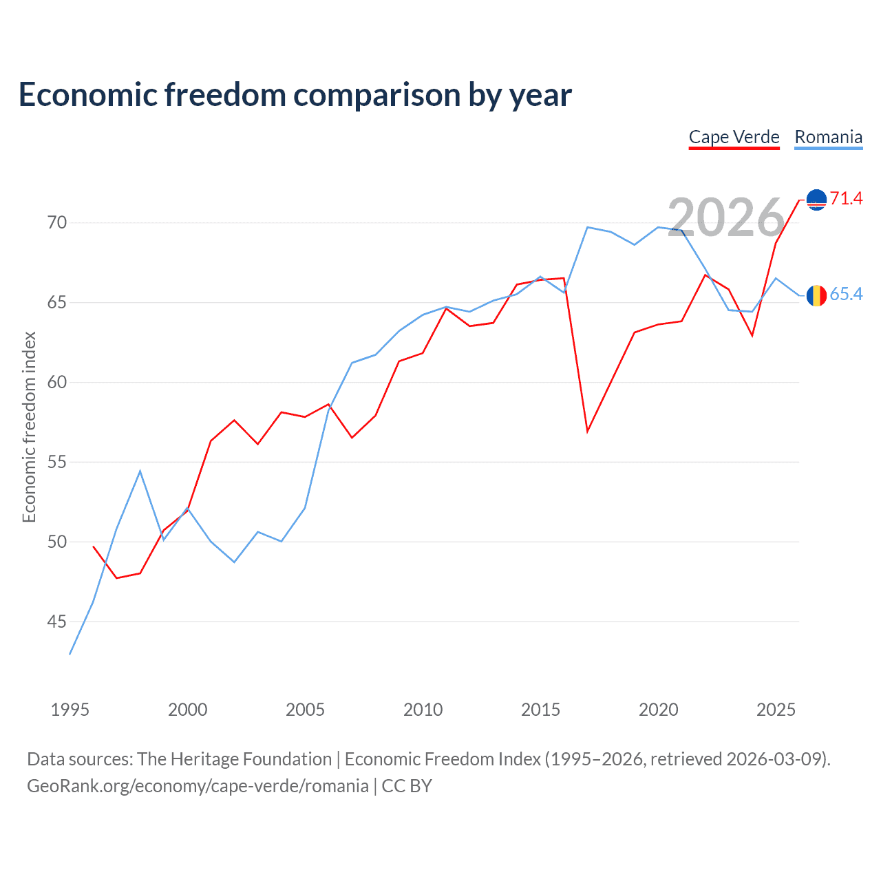 The Economic Freedom Index for Cape Verde is 71.4, ranking 32/197, compared to 65.4 for Romania, ranking 64/197. The chart above displays a comparison of annual changes in economic freedom indexes.