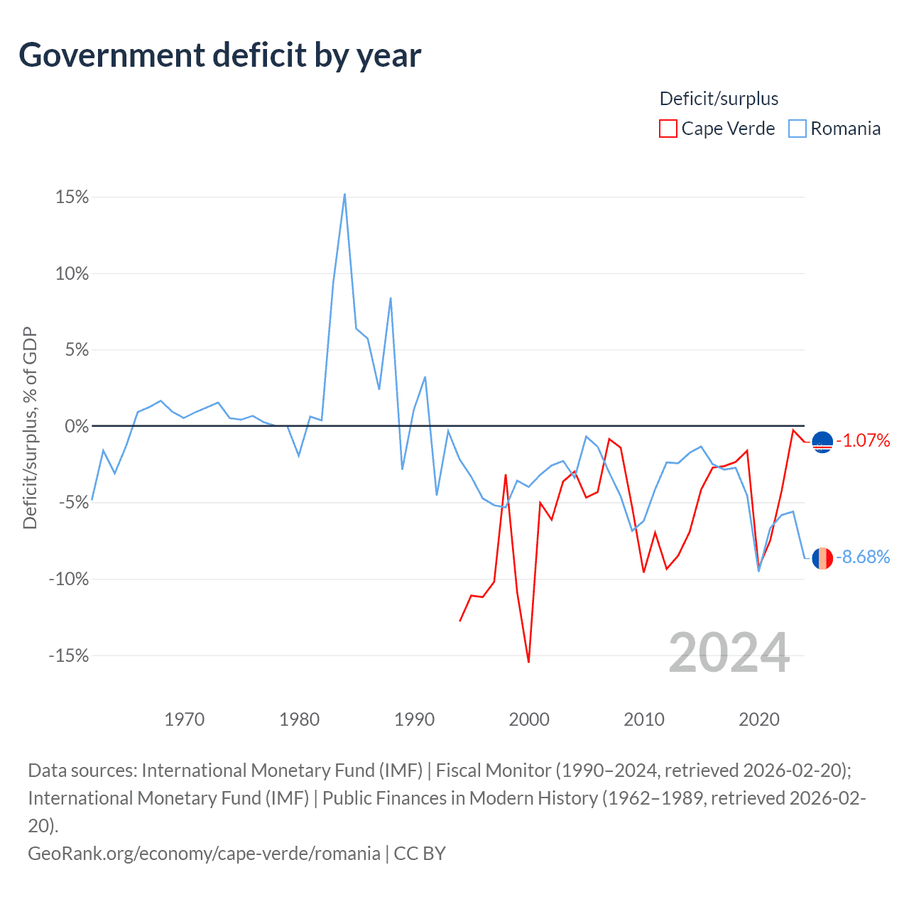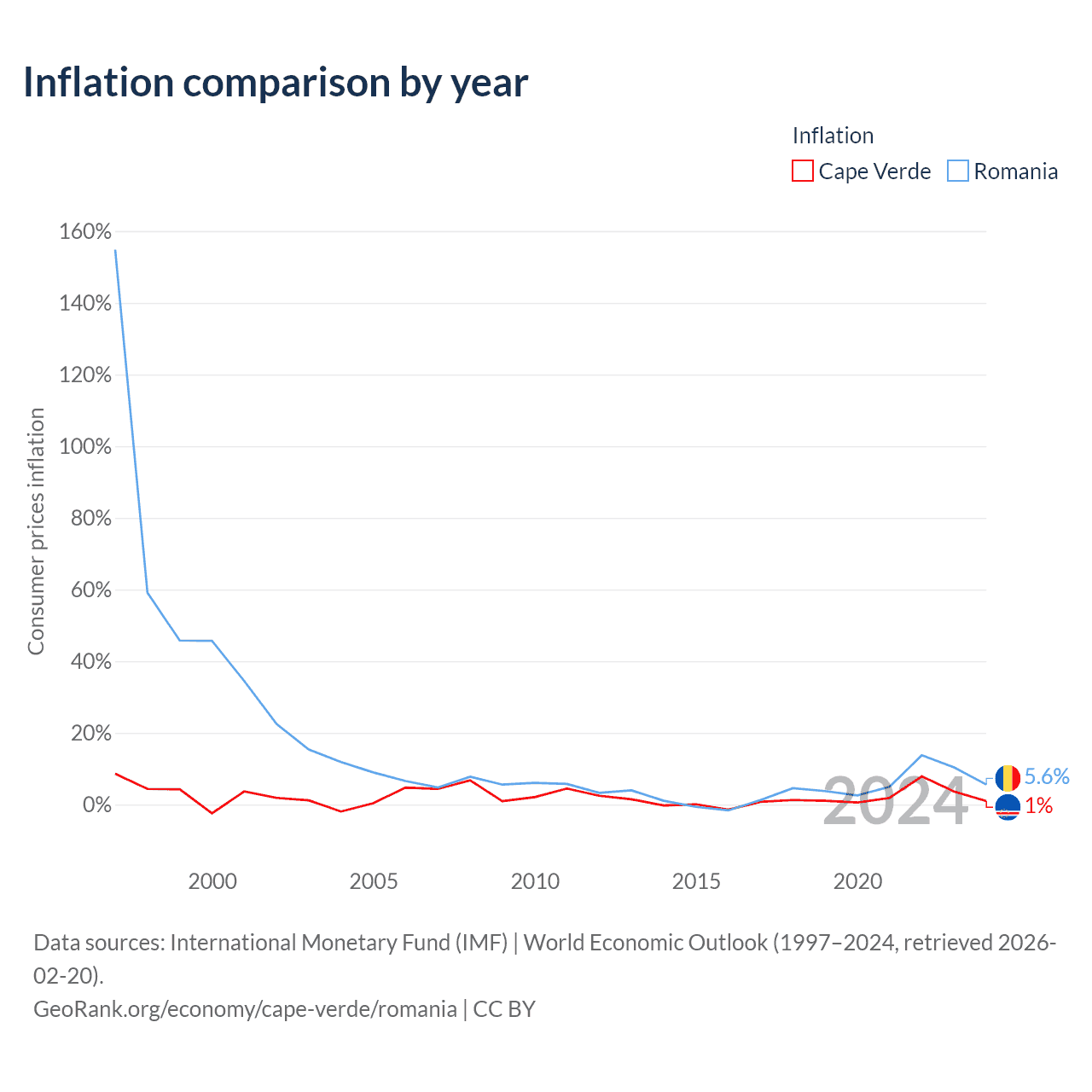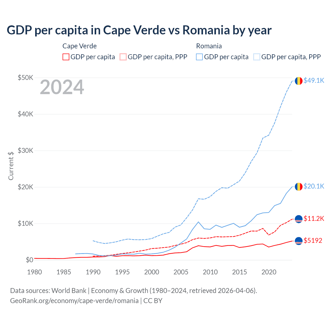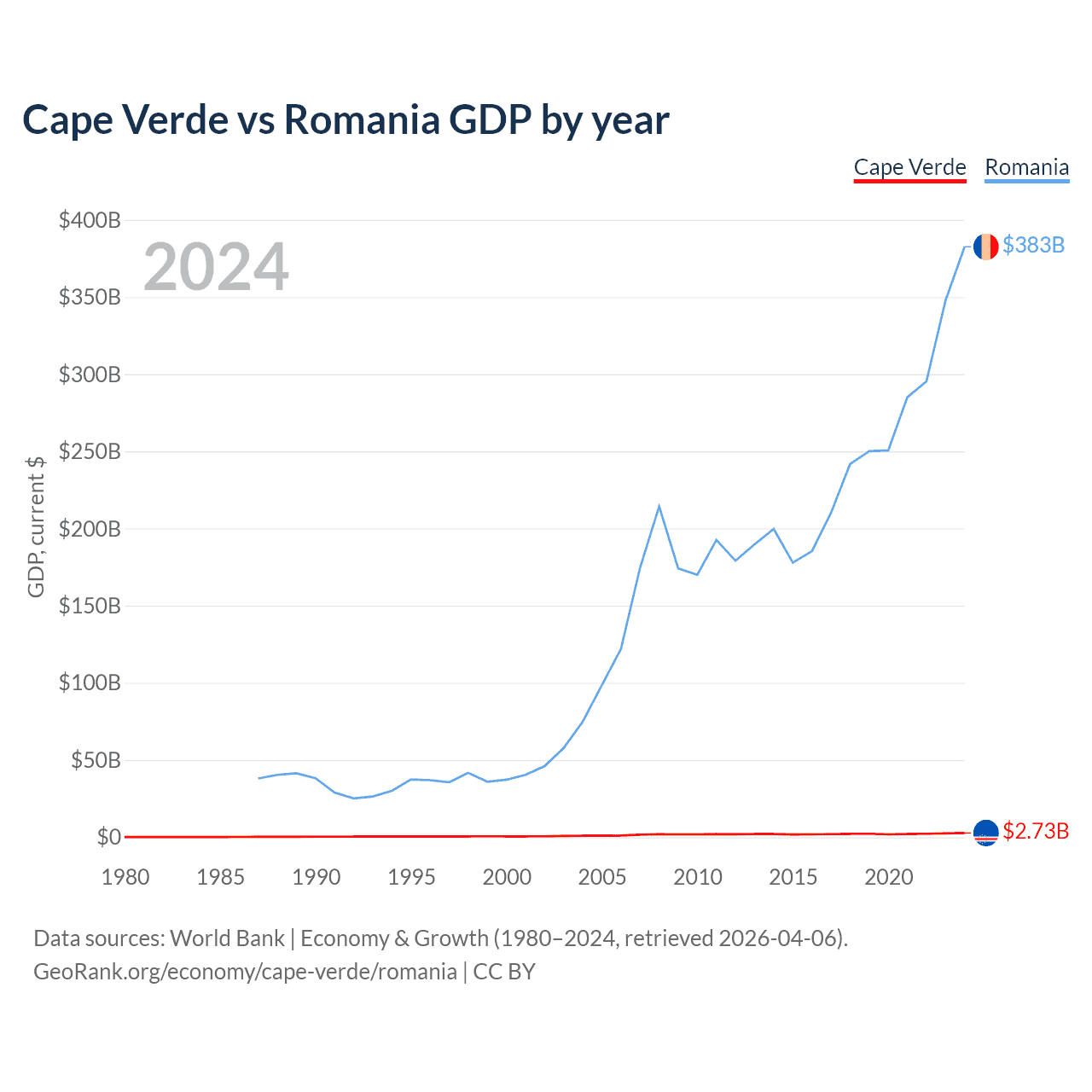 Cape Verde has a GDP of $2.73B compared to $383B for Romania, ranking 172/197 and 42/197 by economy size, respectively.