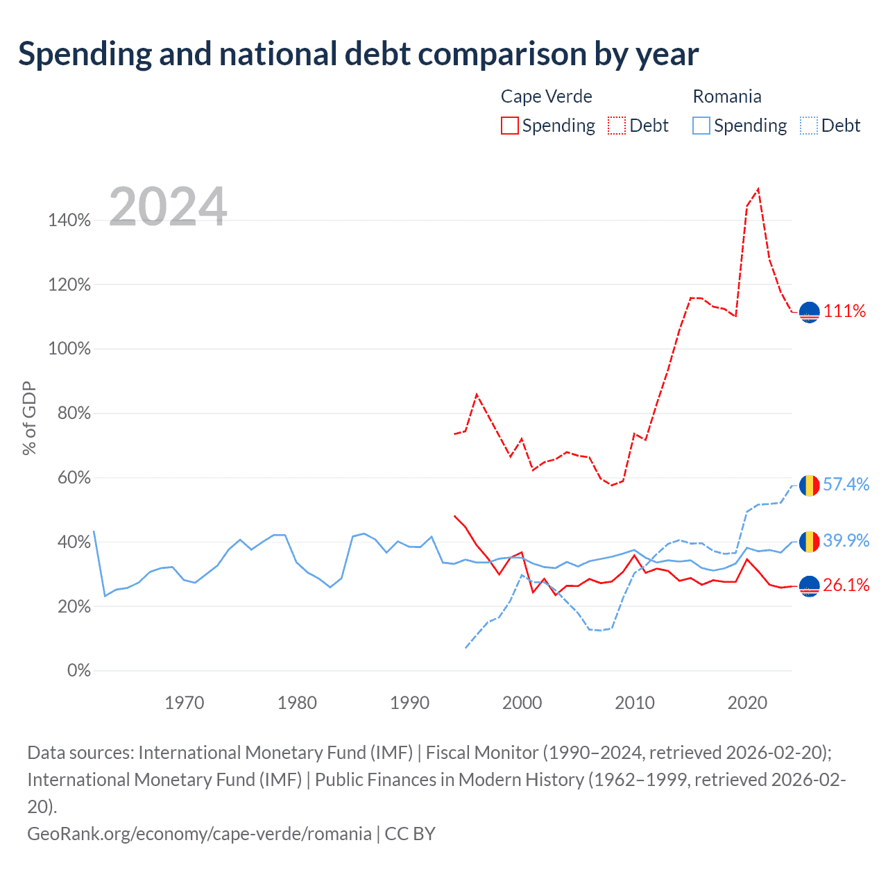 Cape Verde has $3.03B in government debt (111.2% of GDP), compared to $220B (57.4% of GDP) in Romania.