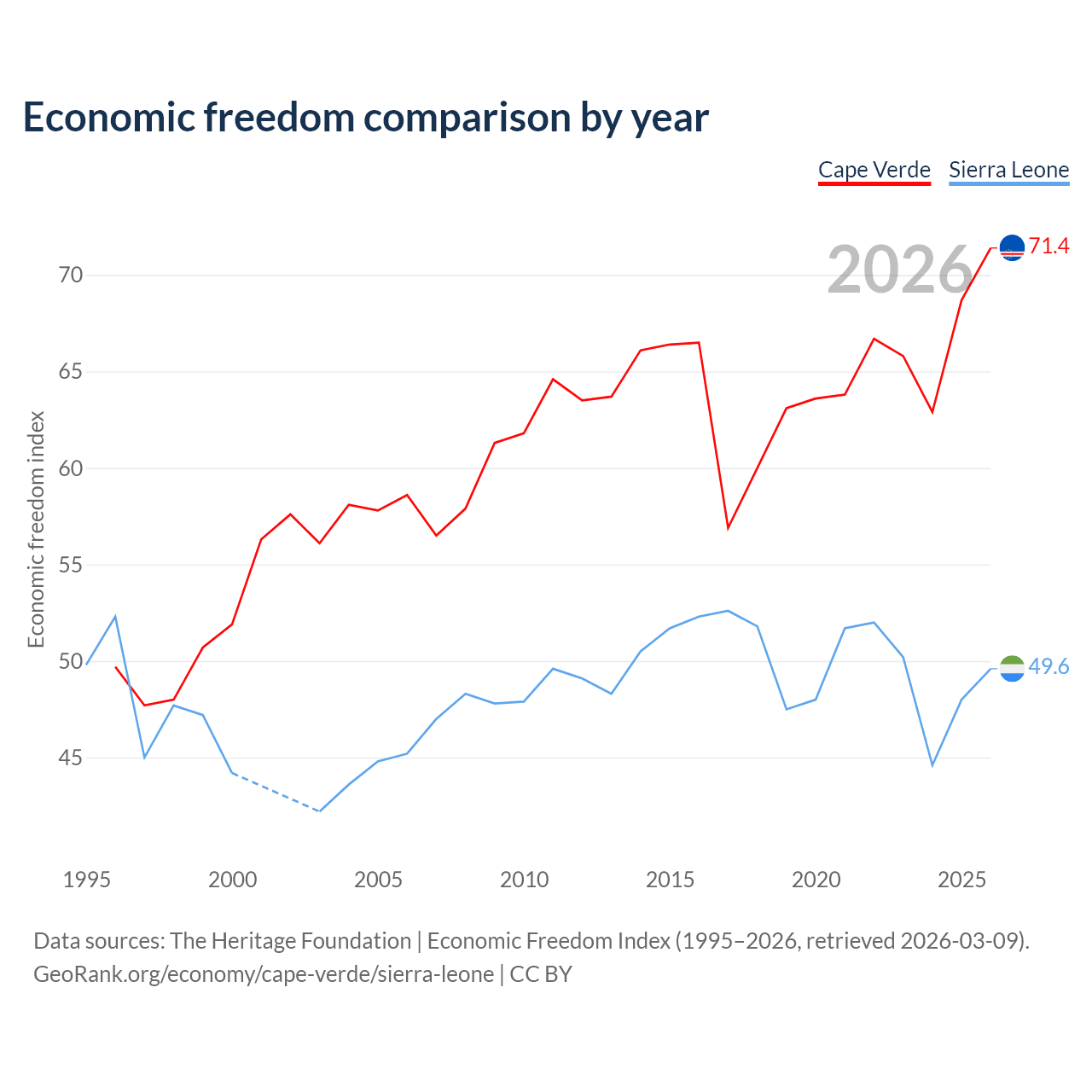 The Economic Freedom Index for Cape Verde is 71.4, ranking 32/197, compared to 49.6 for Sierra Leone, ranking 165/197. The chart above displays a comparison of annual changes in economic freedom indexes.
