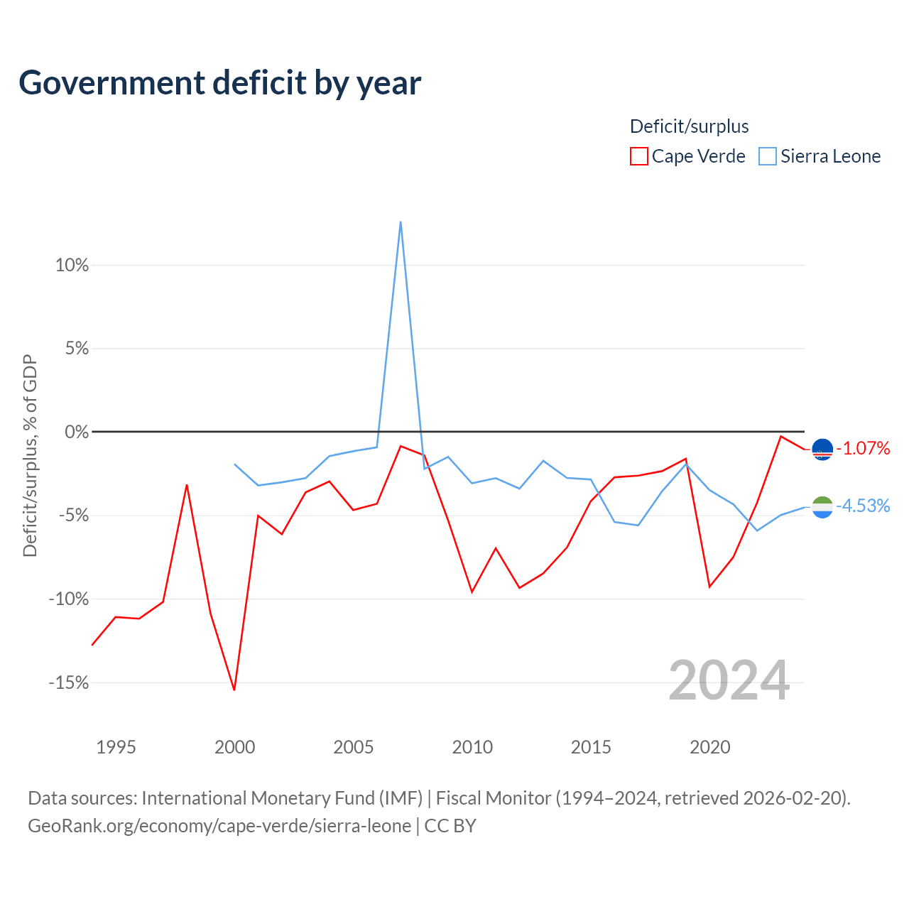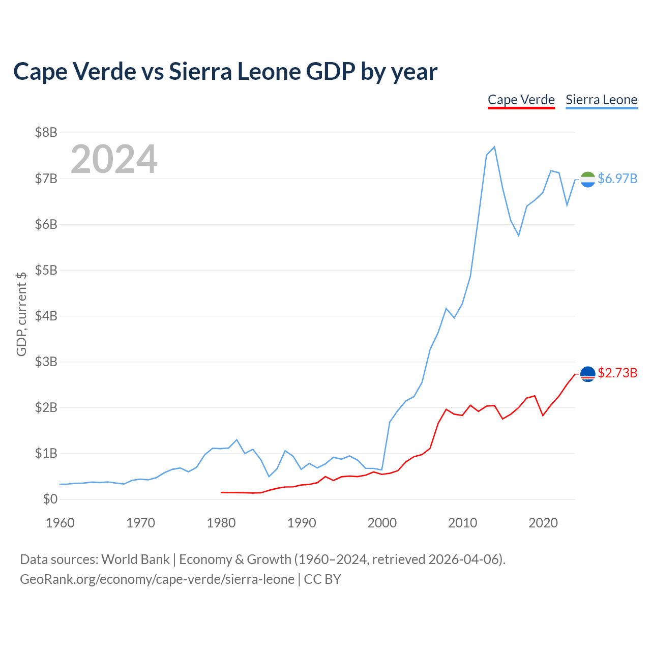 Cape Verde has a GDP of $2.73B compared to $6.97B for Sierra Leone, ranking 172/197 and 160/197 by economy size, respectively.