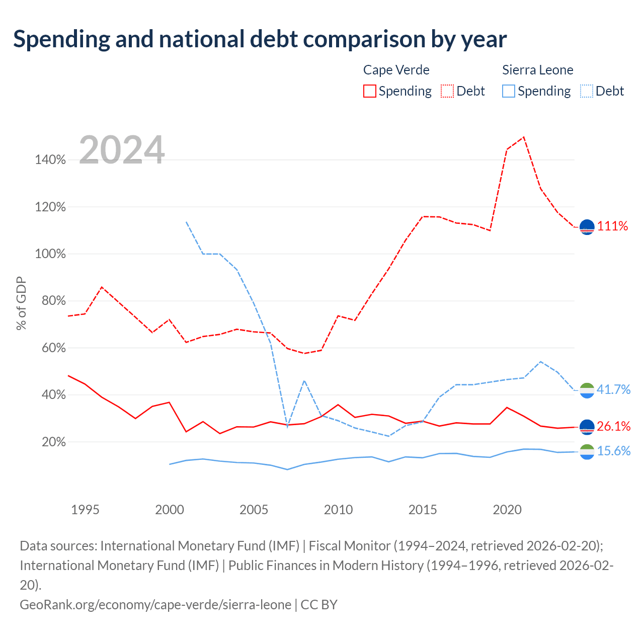 Cape Verde has $3.03B in government debt (111.2% of GDP), compared to $2.91B (41.7% of GDP) in Sierra Leone.