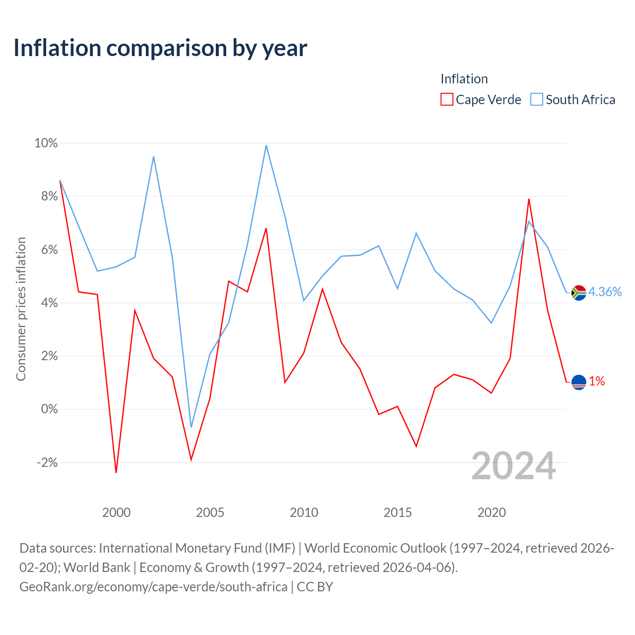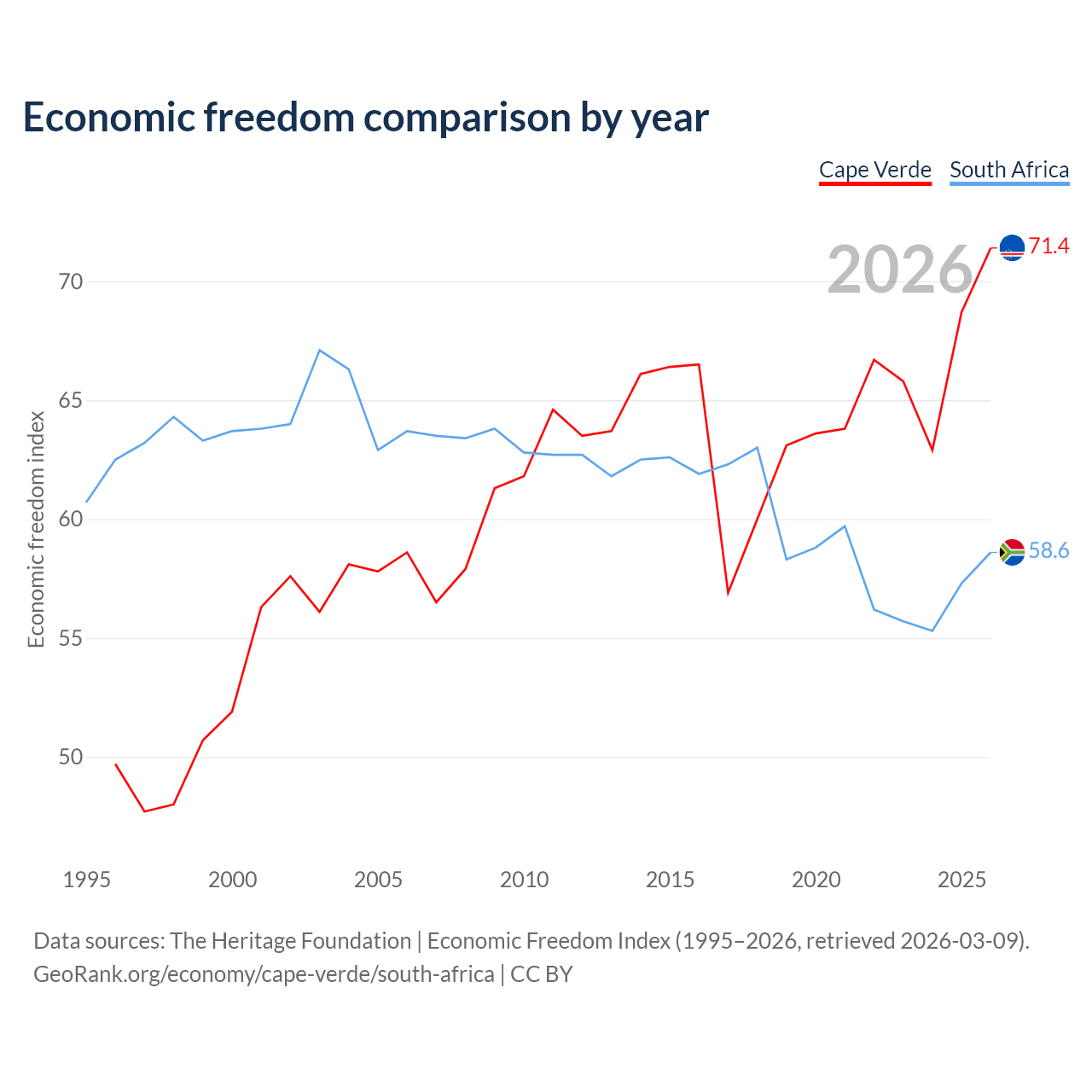 The Economic Freedom Index for Cape Verde is 71.4, ranking 32/197, compared to 58.6 for South Africa, ranking 110/197. The chart above displays a comparison of annual changes in economic freedom indexes.