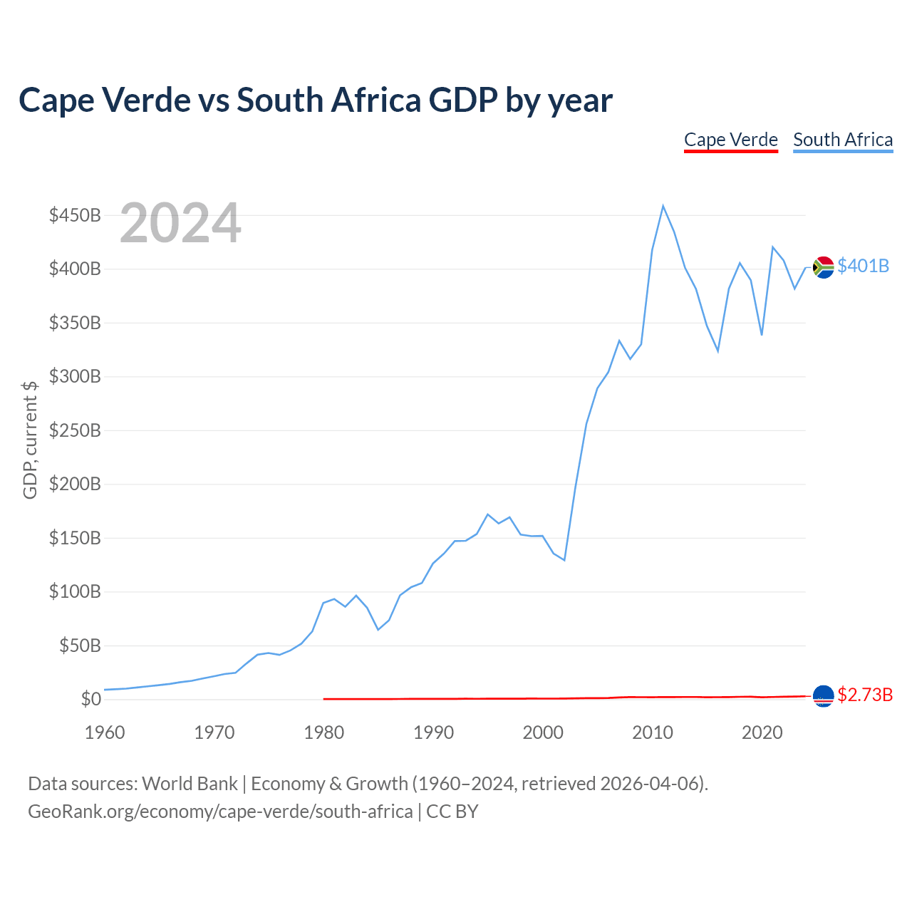 Cape Verde has a GDP of $2.73B compared to $401B for South Africa, ranking 172/197 and 40/197 by economy size, respectively.