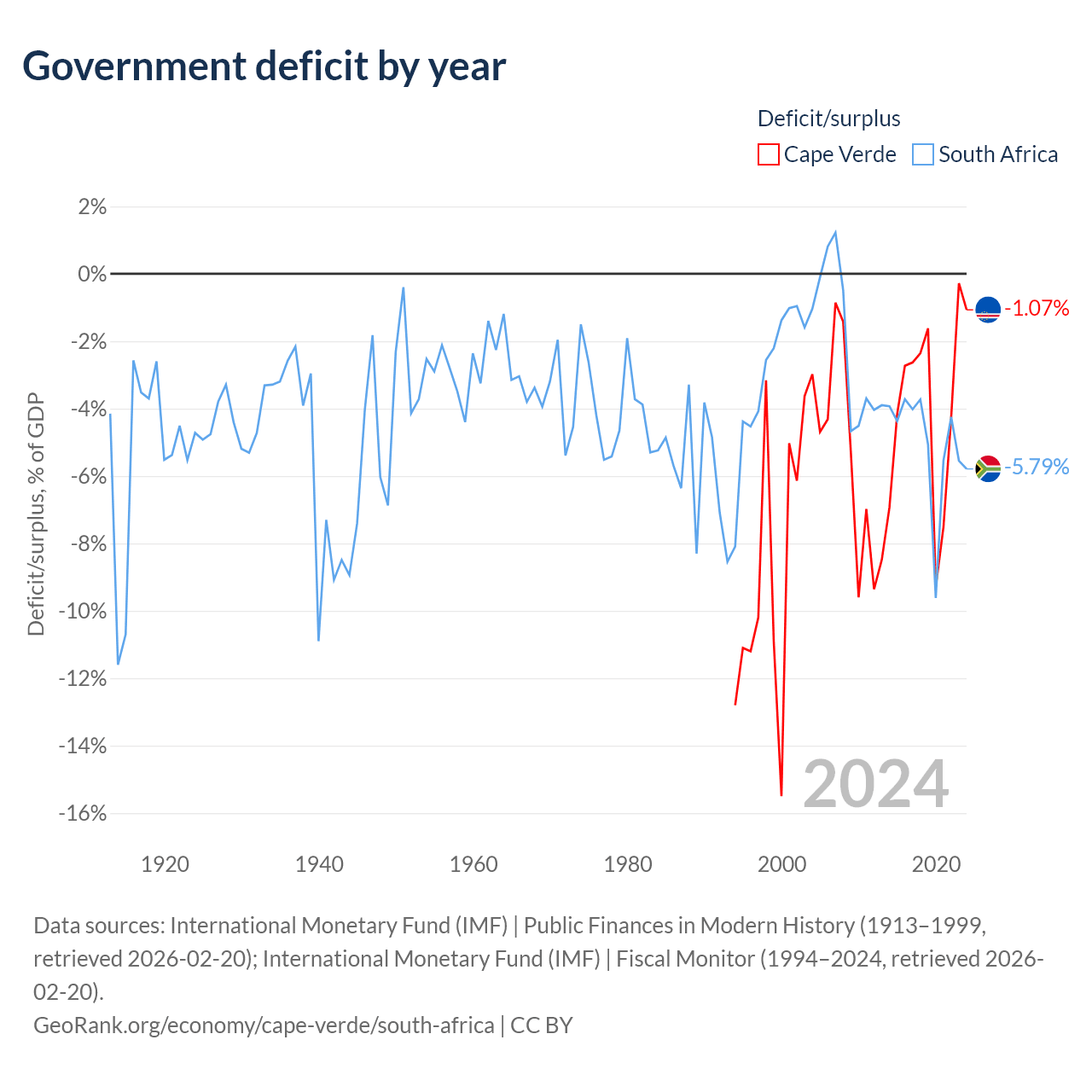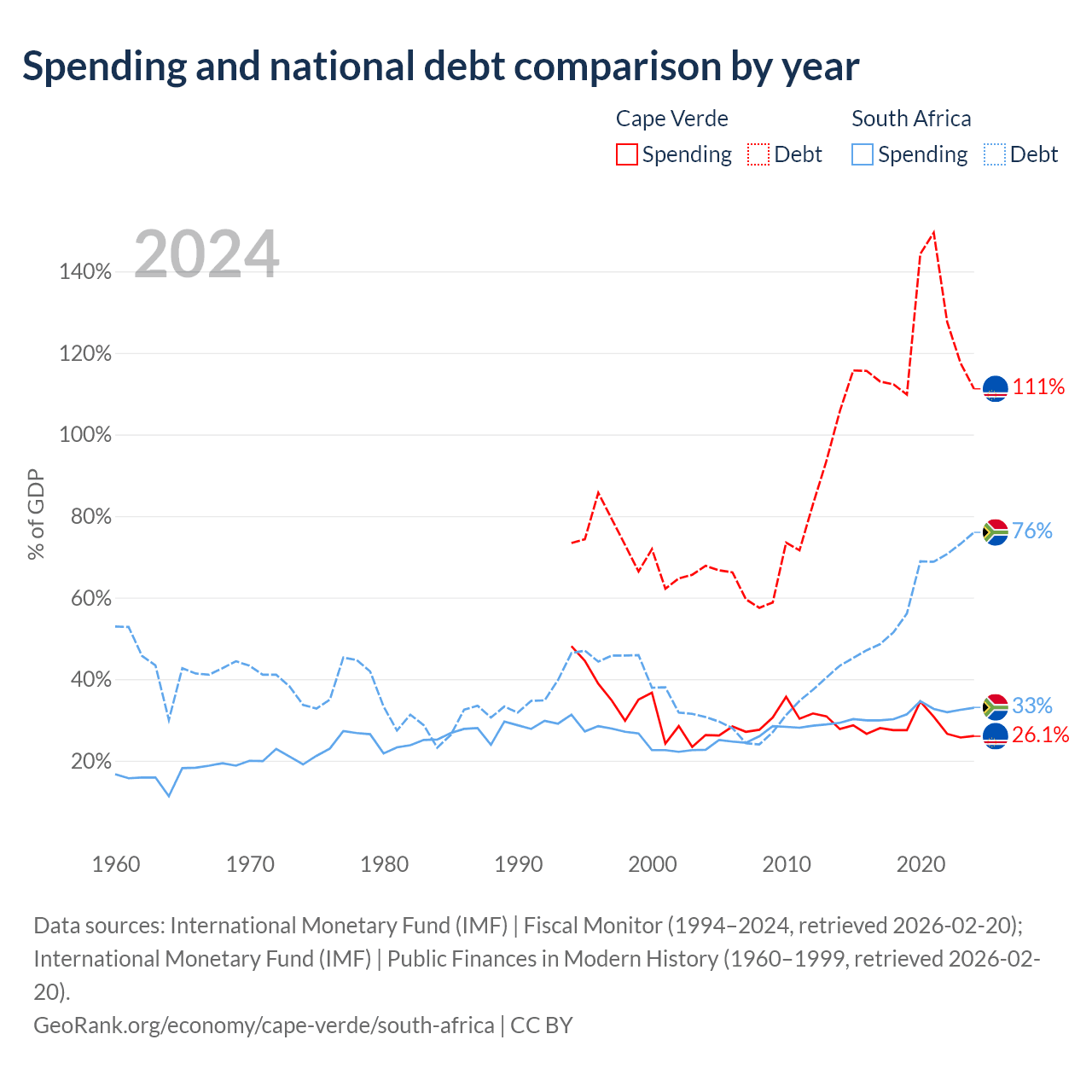 Cape Verde has $3.03B in government debt (111.2% of GDP), compared to $305B (76% of GDP) in South Africa.