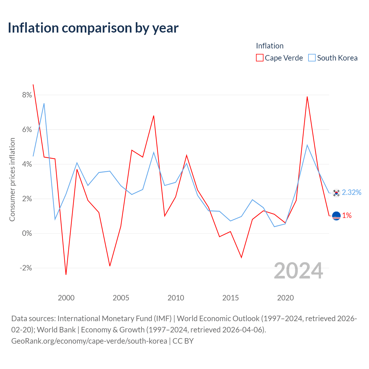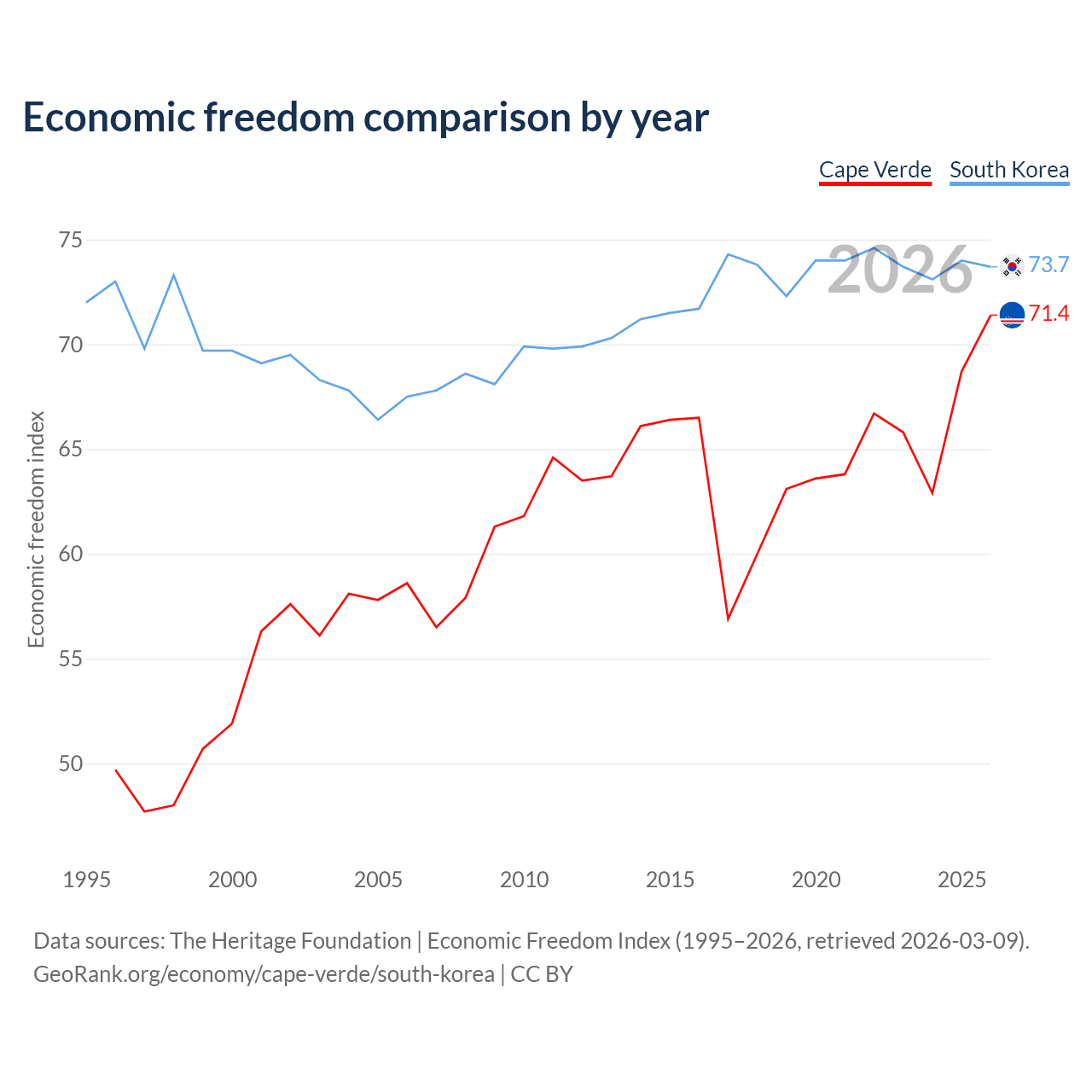 The Economic Freedom Index for Cape Verde is 71.4, ranking 32/197, compared to 73.7 for South Korea, ranking 24/197. The chart above displays a comparison of annual changes in economic freedom indexes.