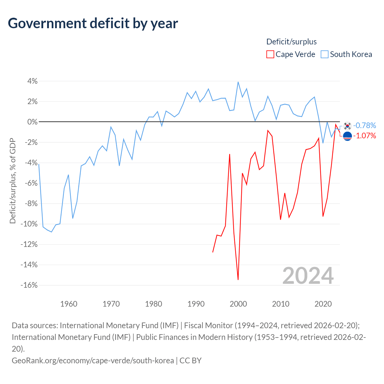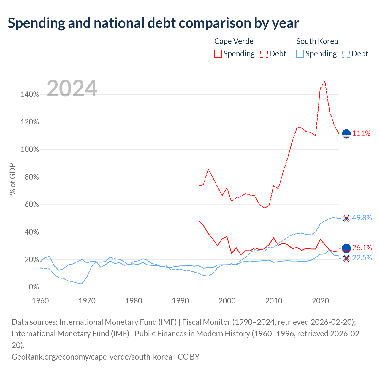 Cape Verde has $3.03B in government debt (111.2% of GDP), compared to $934B (49.8% of GDP) in South Korea.