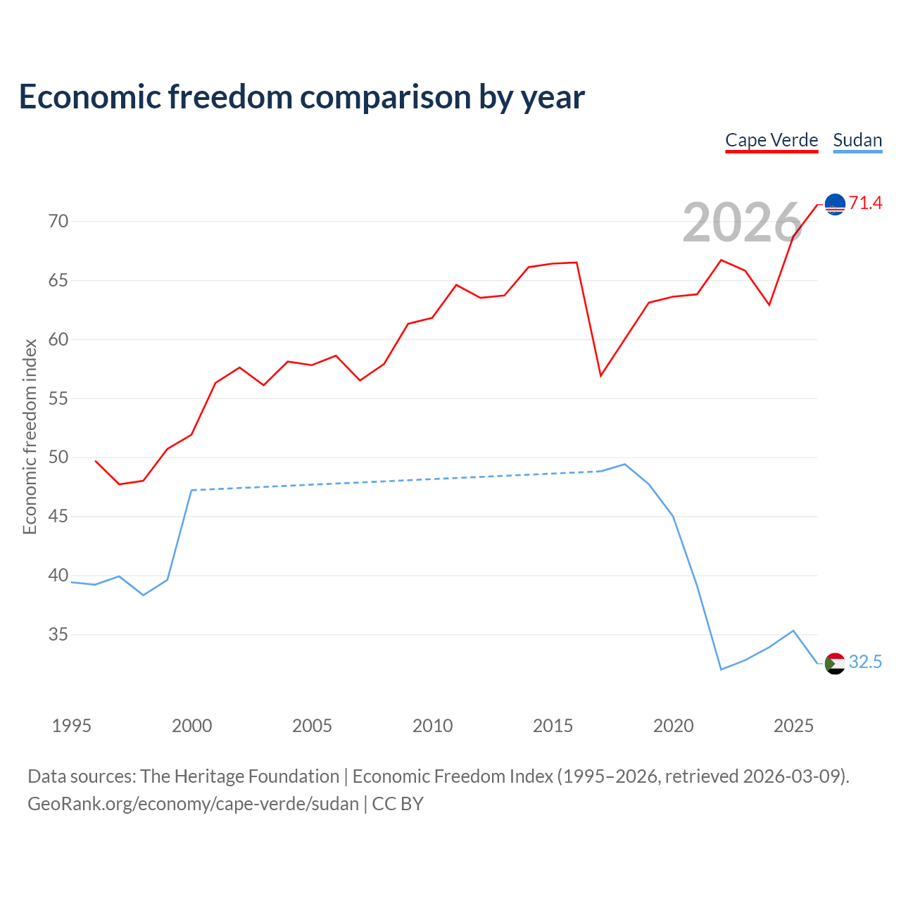 The Economic Freedom Index for Cape Verde is 71.4, ranking 32/197, compared to 32.5 for Sudan, ranking 191/197. The chart above displays a comparison of annual changes in economic freedom indexes.
