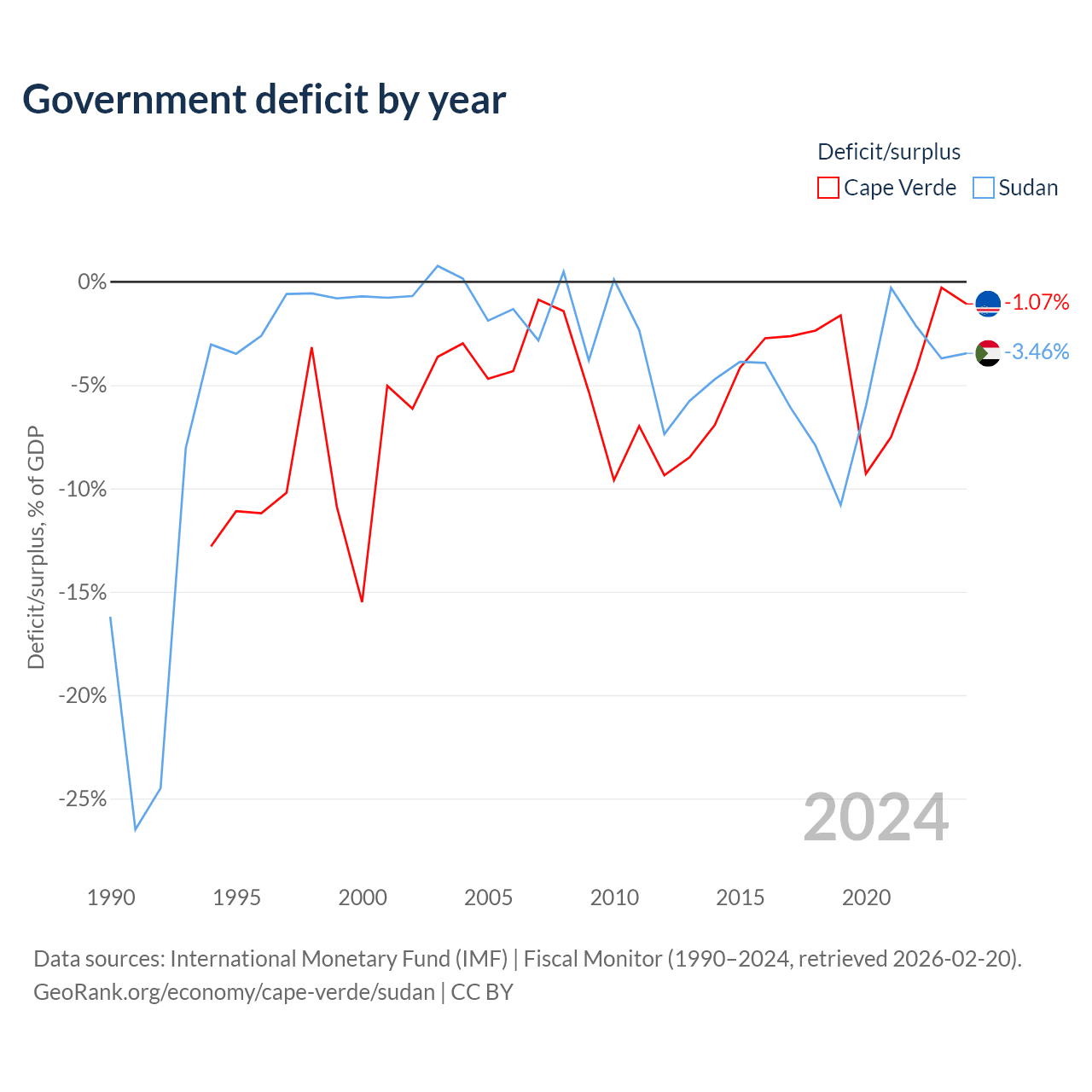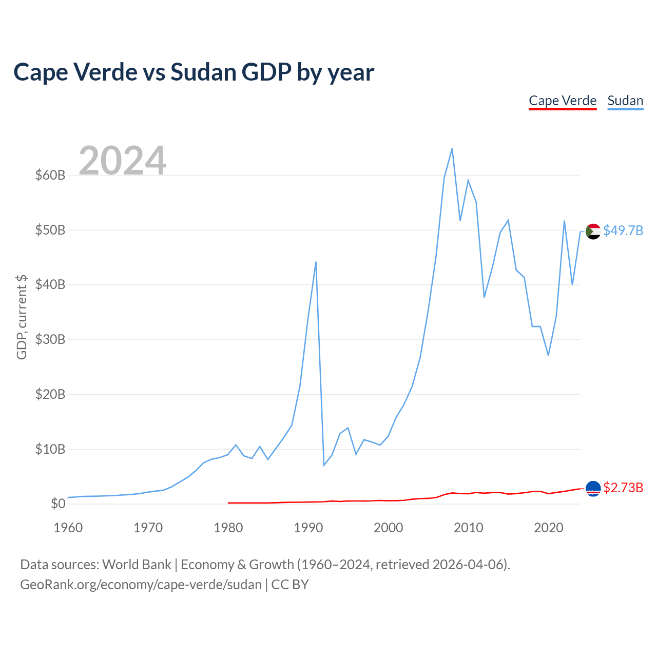 Cape Verde has a GDP of $2.73B compared to $49.7B for Sudan, ranking 172/197 and 94/197 by economy size, respectively.