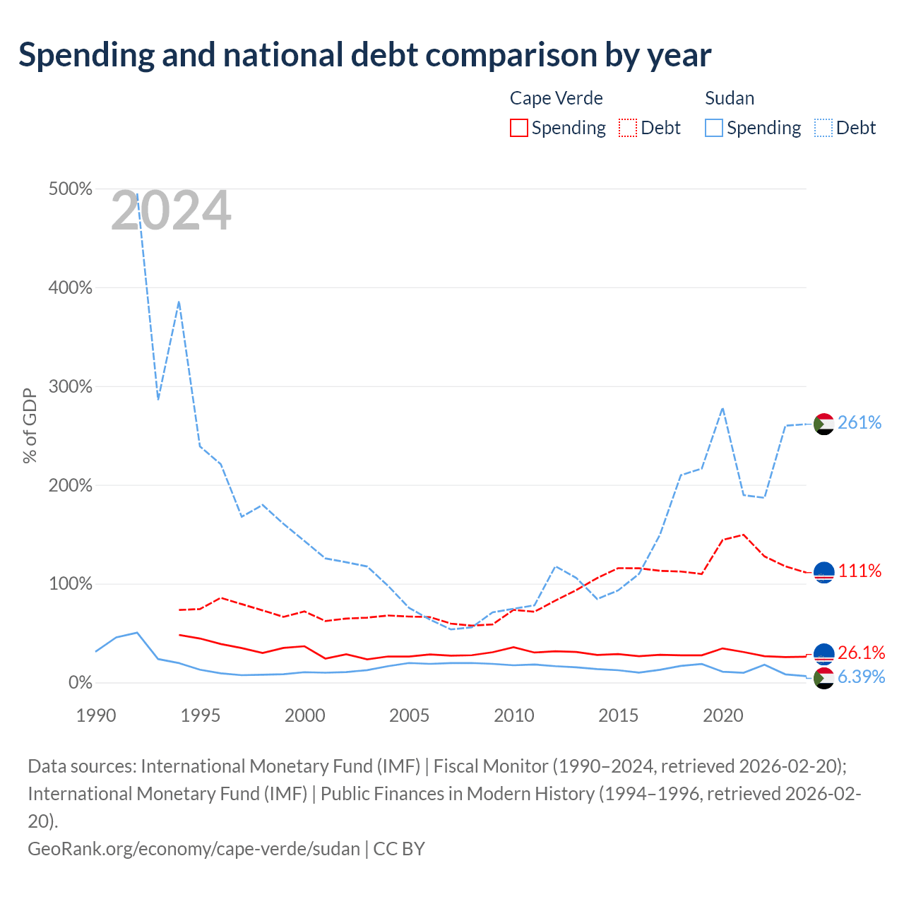 Cape Verde has $3.03B in government debt (111.2% of GDP), compared to $130B (261.4% of GDP) in Sudan.