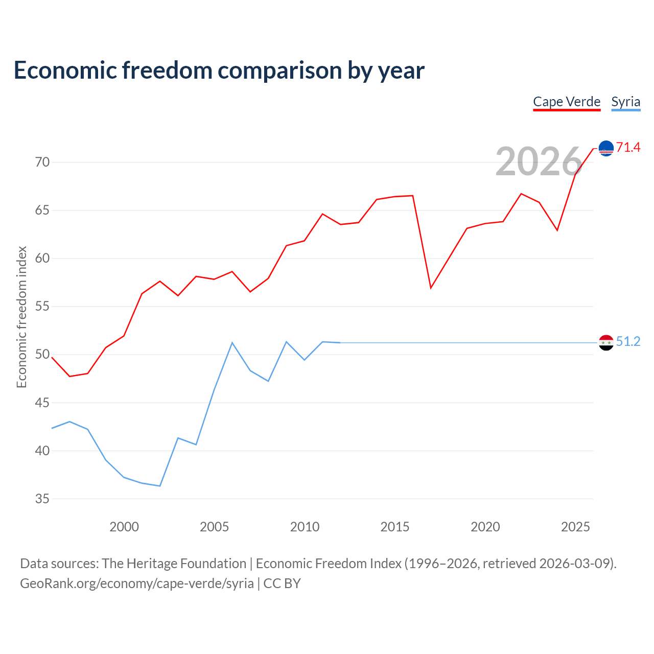 The Economic Freedom Index for Cape Verde is 71.4, ranking 32/197, compared to 51.2 for Syria, ranking 155/197. The chart above displays a comparison of annual changes in economic freedom indexes.