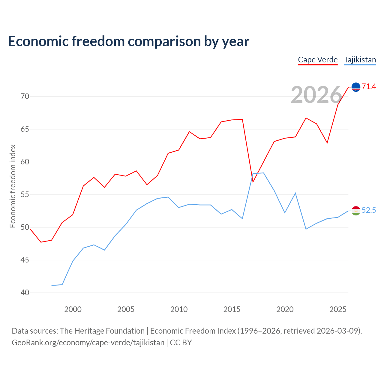 The Economic Freedom Index for Cape Verde is 71.4, ranking 32/197, compared to 52.5 for Tajikistan, ranking 147/197. The chart above displays a comparison of annual changes in economic freedom indexes.
