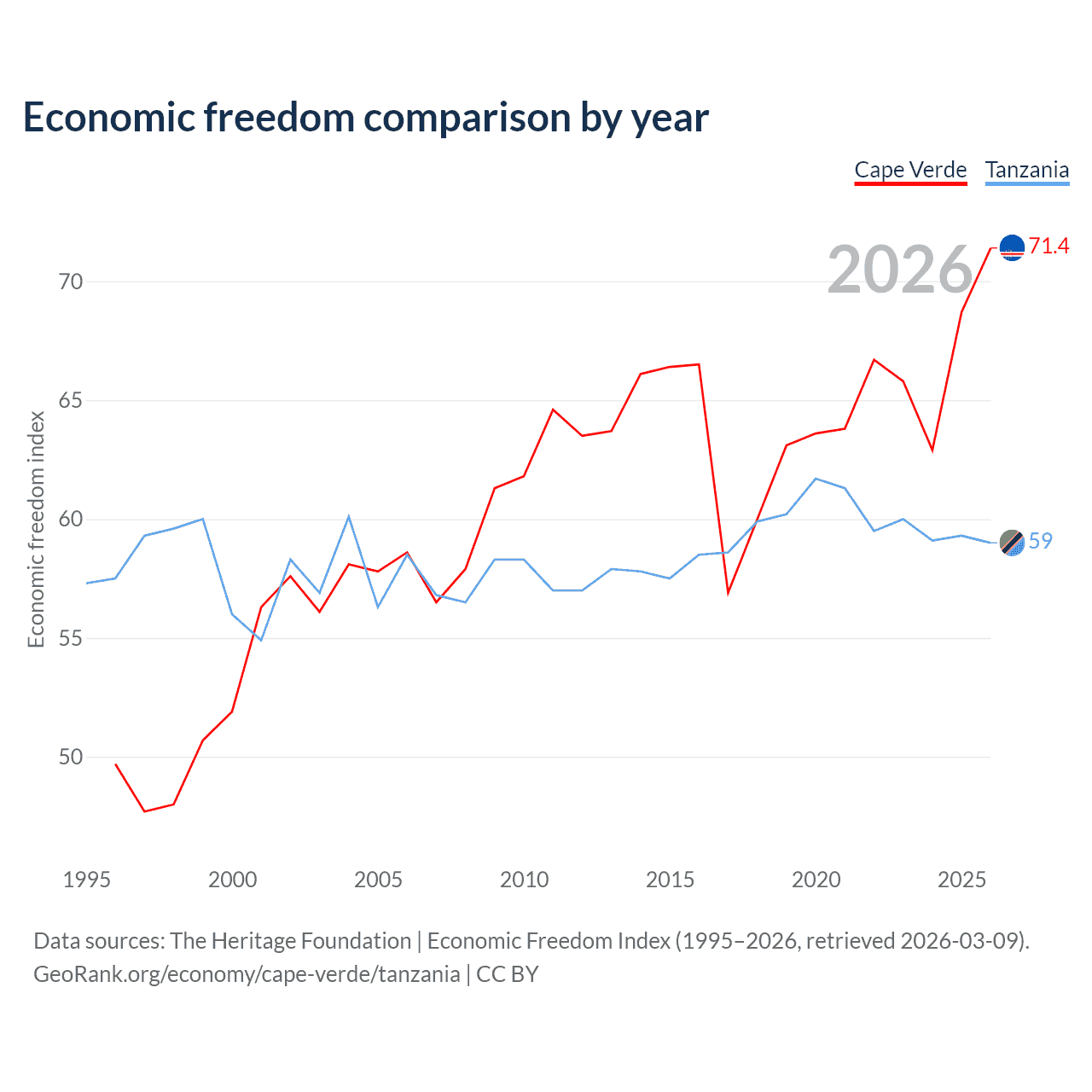 The Economic Freedom Index for Cape Verde is 71.4, ranking 32/197, compared to 59 for Tanzania, ranking 106/197. The chart above displays a comparison of annual changes in economic freedom indexes.