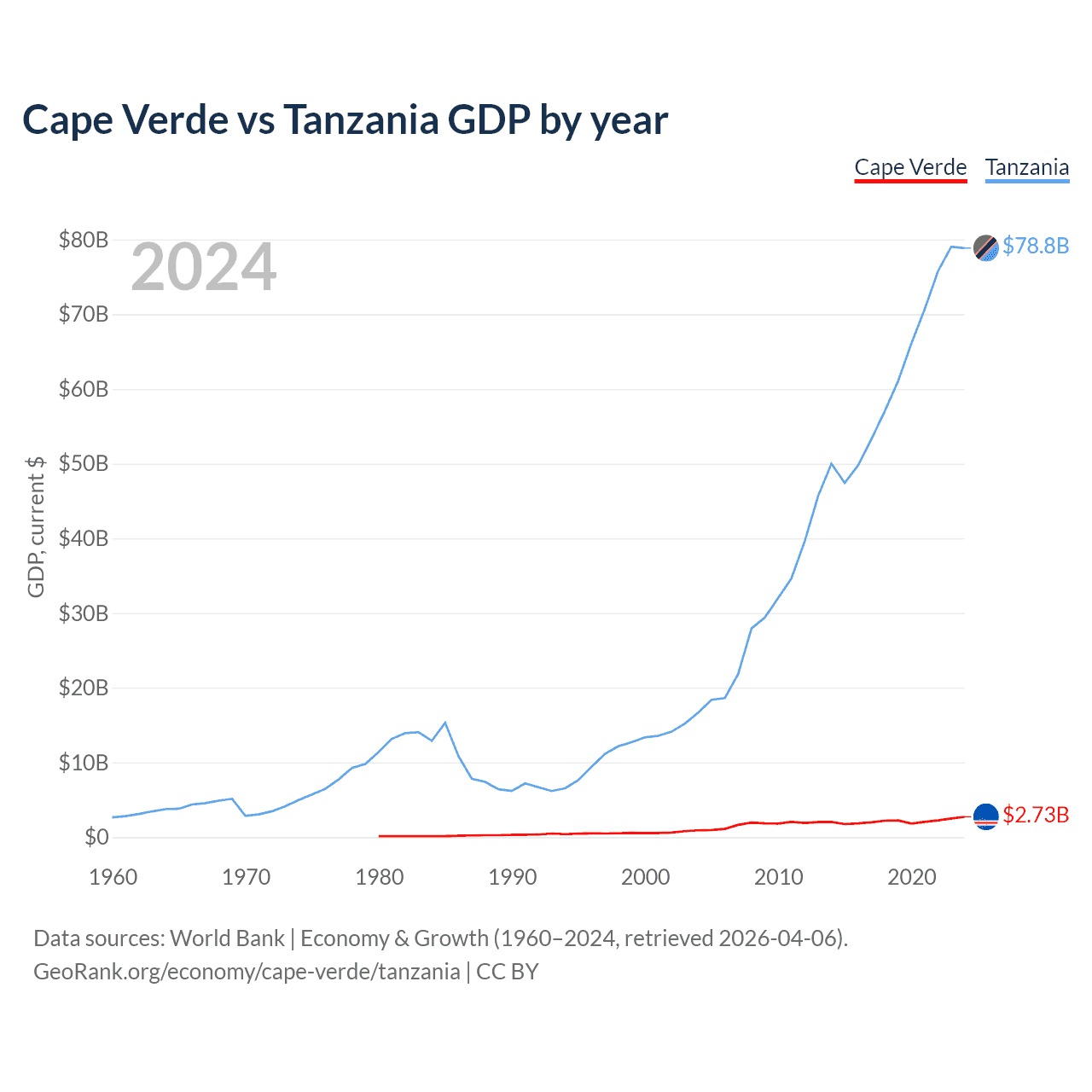 Cape Verde has a GDP of $2.73B compared to $78.8B for Tanzania, ranking 172/197 and 82/197 by economy size, respectively.