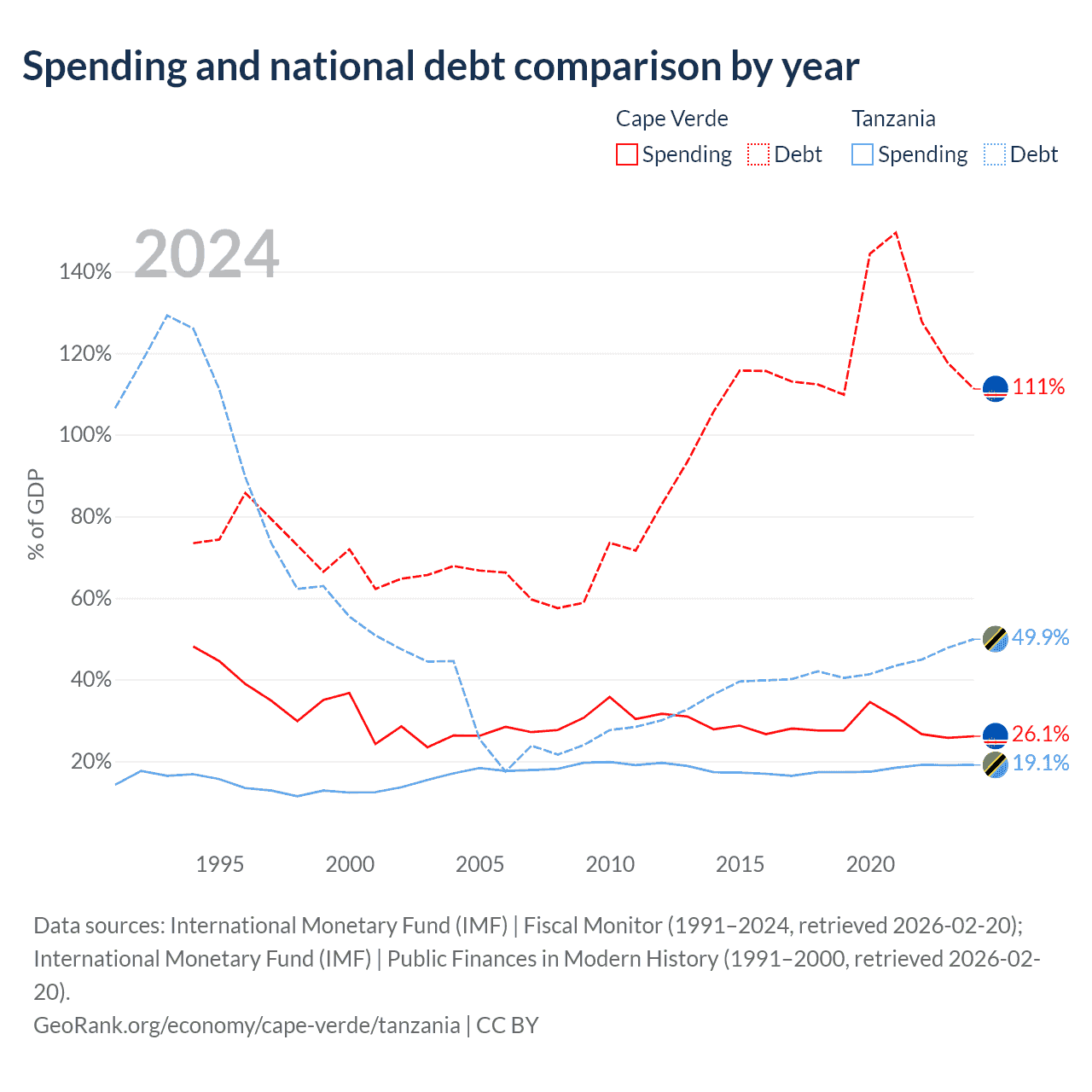 Cape Verde has $3.03B in government debt (111.2% of GDP), compared to $39.3B (49.9% of GDP) in Tanzania.