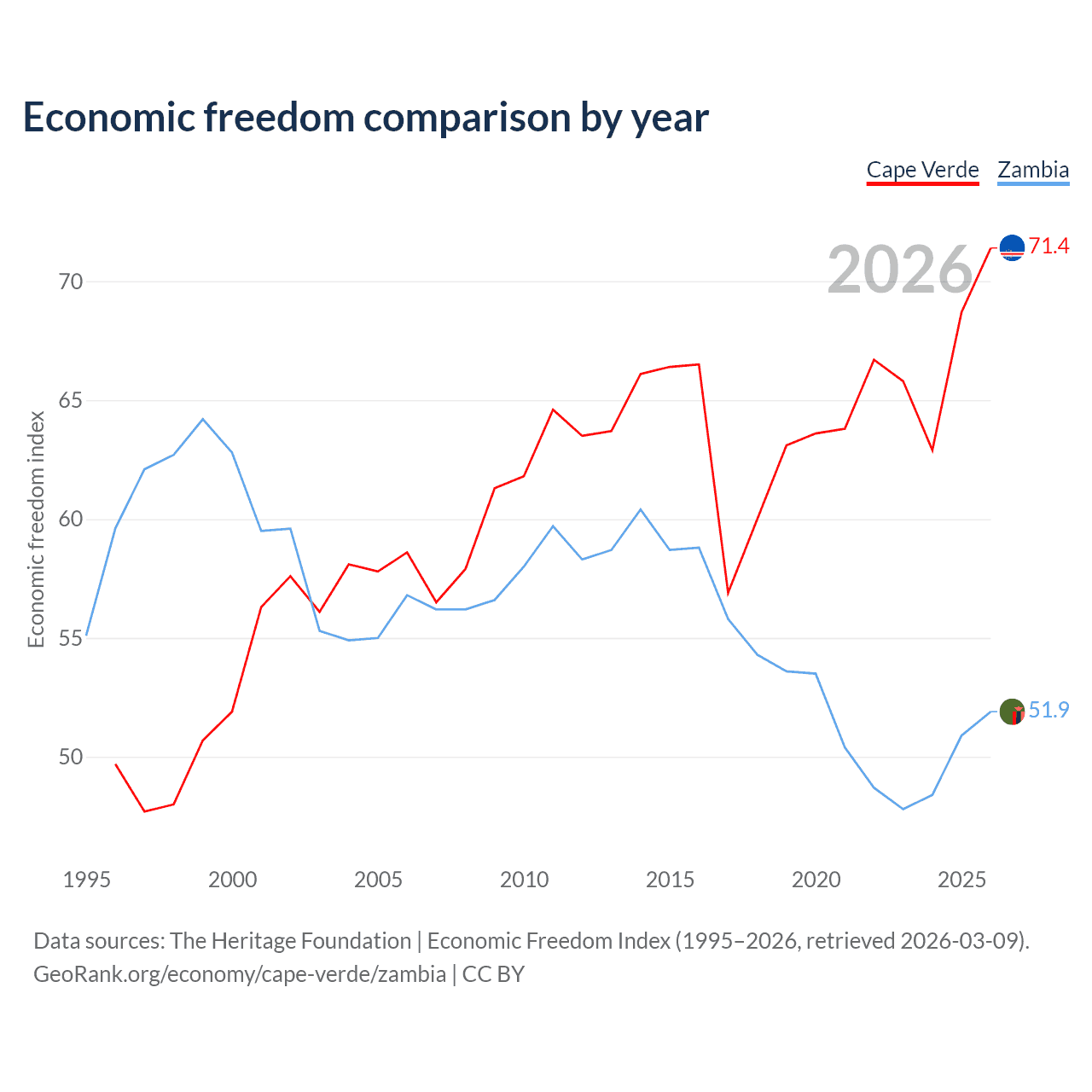 The Economic Freedom Index for Cape Verde is 71.4, ranking 32/197, compared to 51.9 for Zambia, ranking 152/197. The chart above displays a comparison of annual changes in economic freedom indexes.