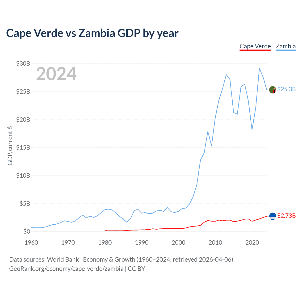 Cape Verde has a GDP of $2.73B compared to $25.3B for Zambia, ranking 172/197 and 116/197 by economy size, respectively.