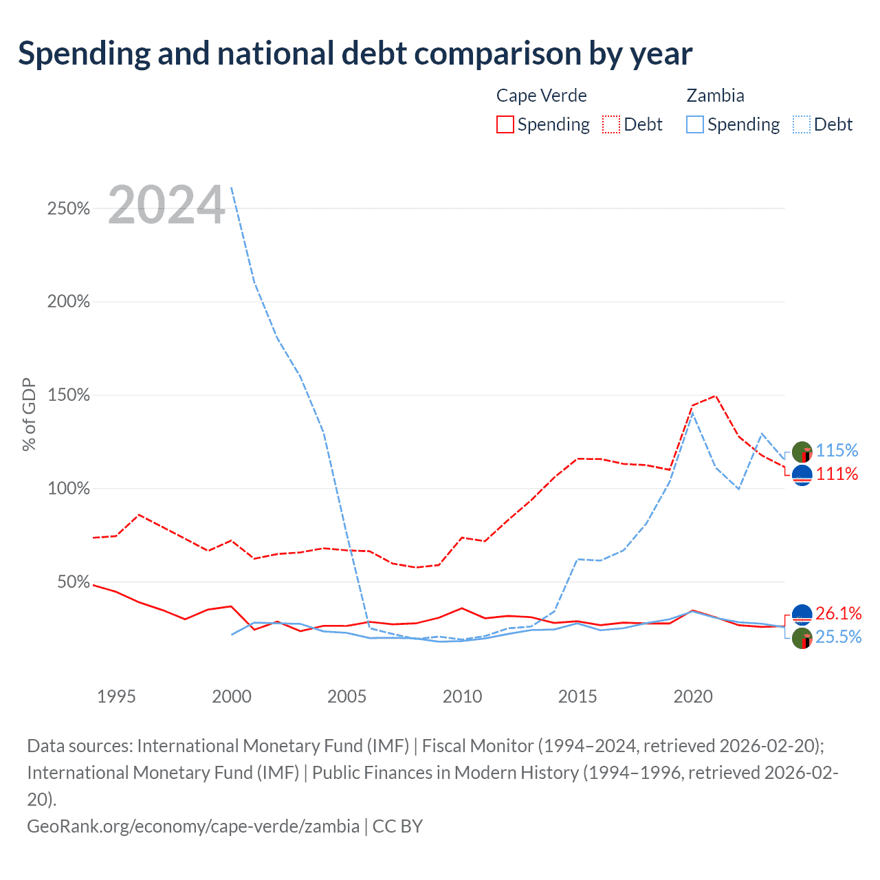 Cape Verde has $3.03B in government debt (111.2% of GDP), compared to $29.1B (114.9% of GDP) in Zambia.