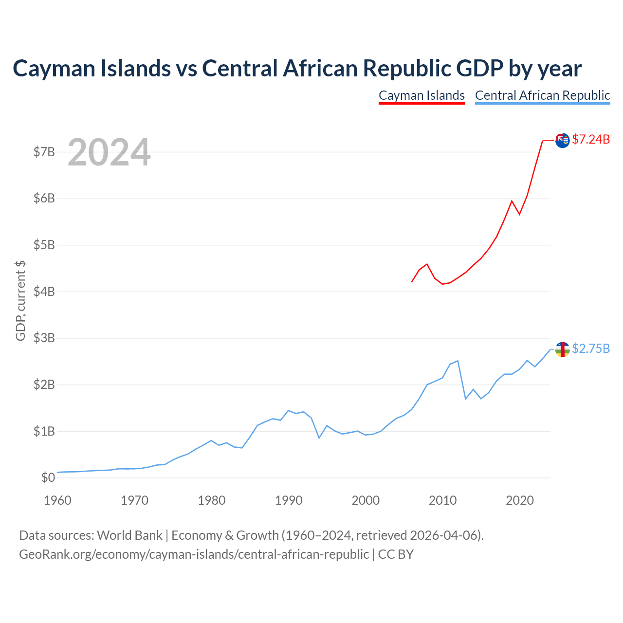 The Cayman Islands has a GDP of $7.24B compared to $2.75B for the Central African Republic, ranking 158/197 and 171/197 by economy size, respectively.
