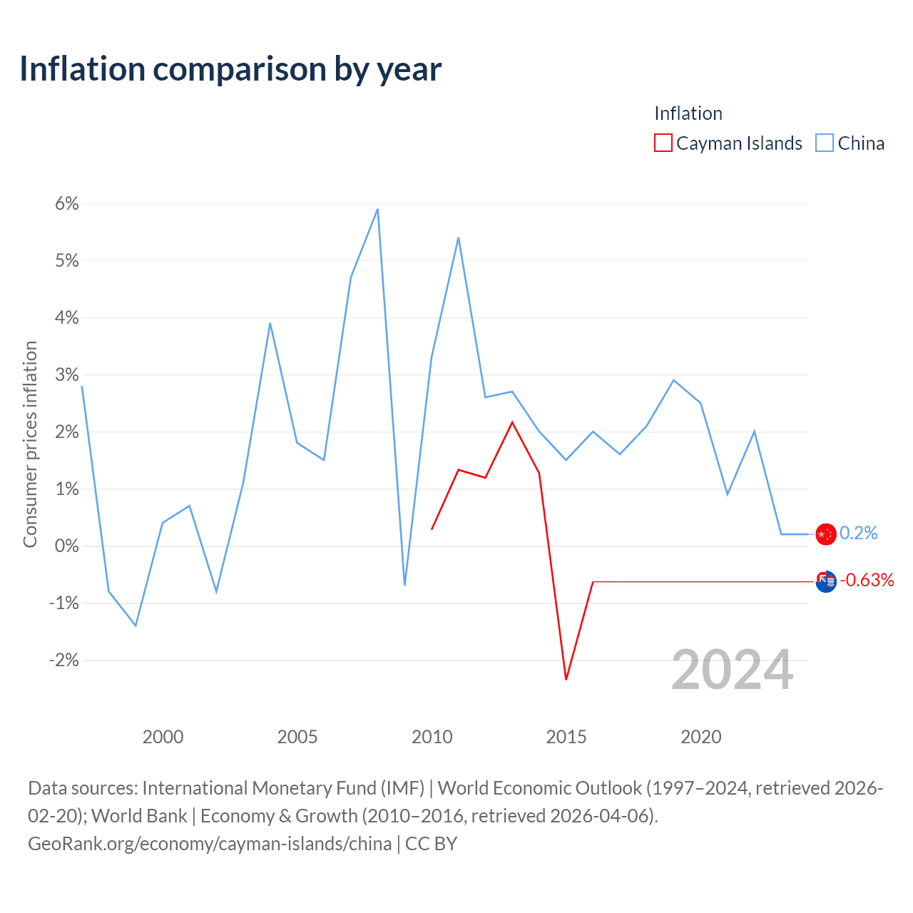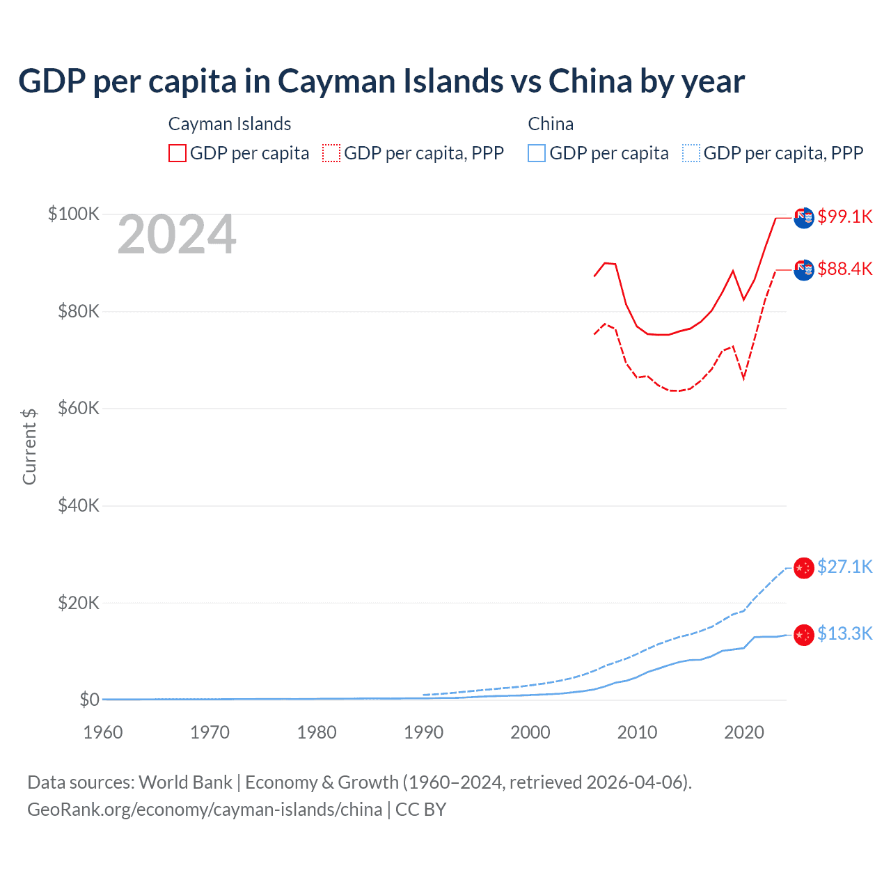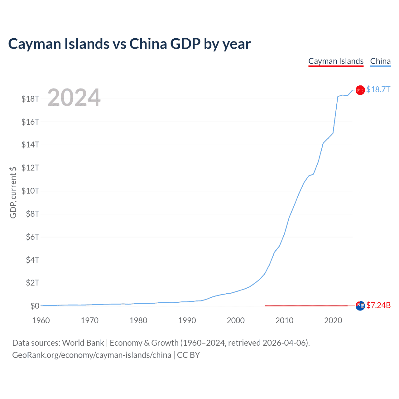 The Cayman Islands has a GDP of $7.24B compared to $18.7T for China, ranking 158/197 and 2/197 by economy size, respectively.