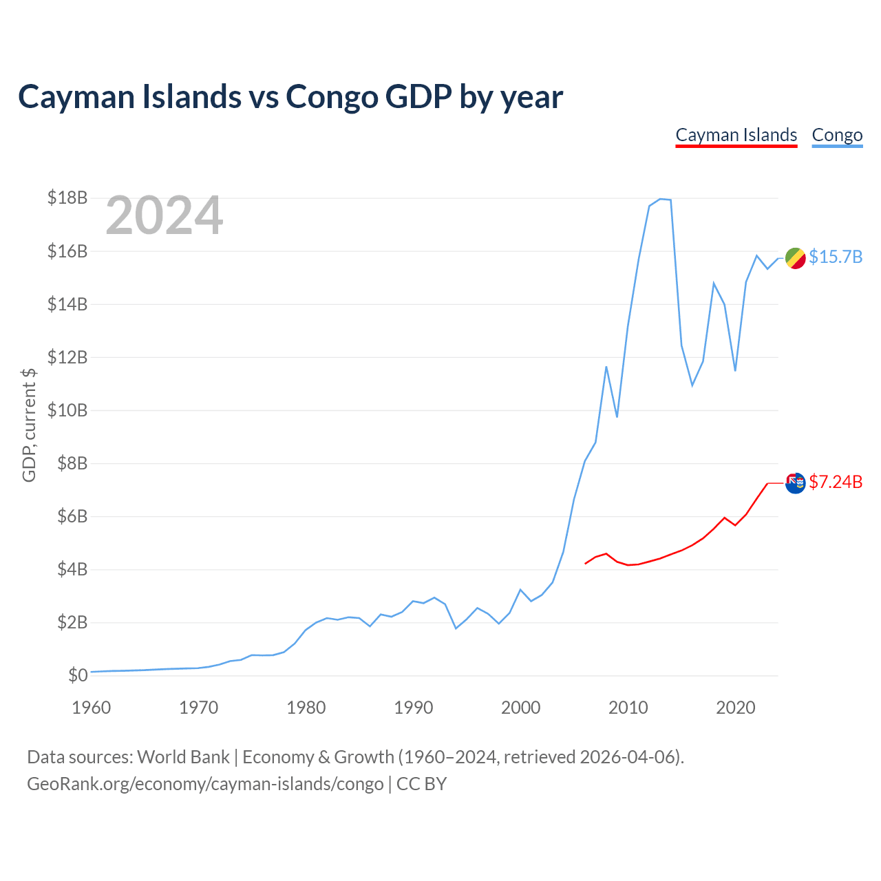 The Cayman Islands has a GDP of $7.24B compared to $15.7B for the Congo, ranking 158/197 and 141/197 by economy size, respectively.