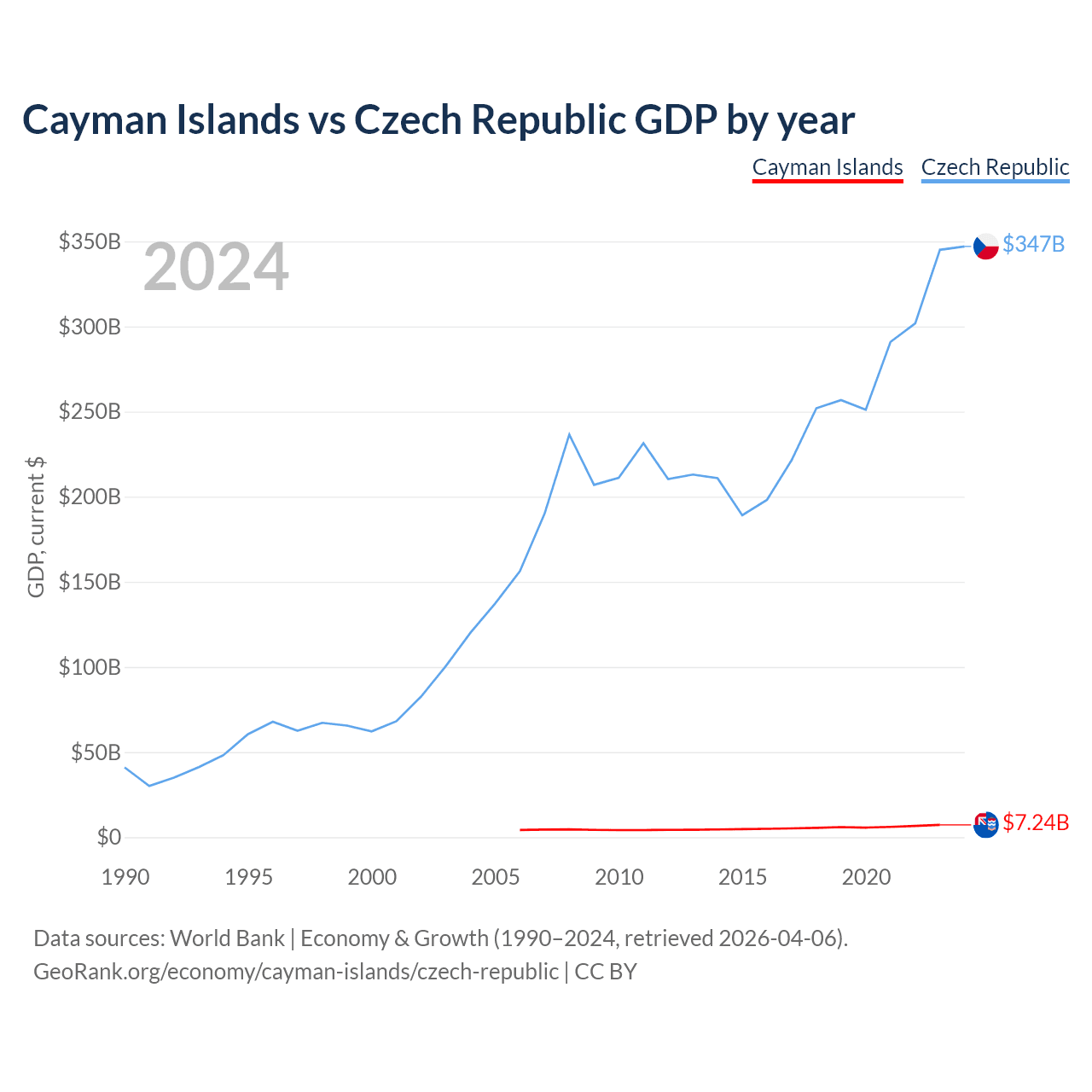 The Cayman Islands has a GDP of $7.24B compared to $347B for the Czech Republic, ranking 158/197 and 44/197 by economy size, respectively.
