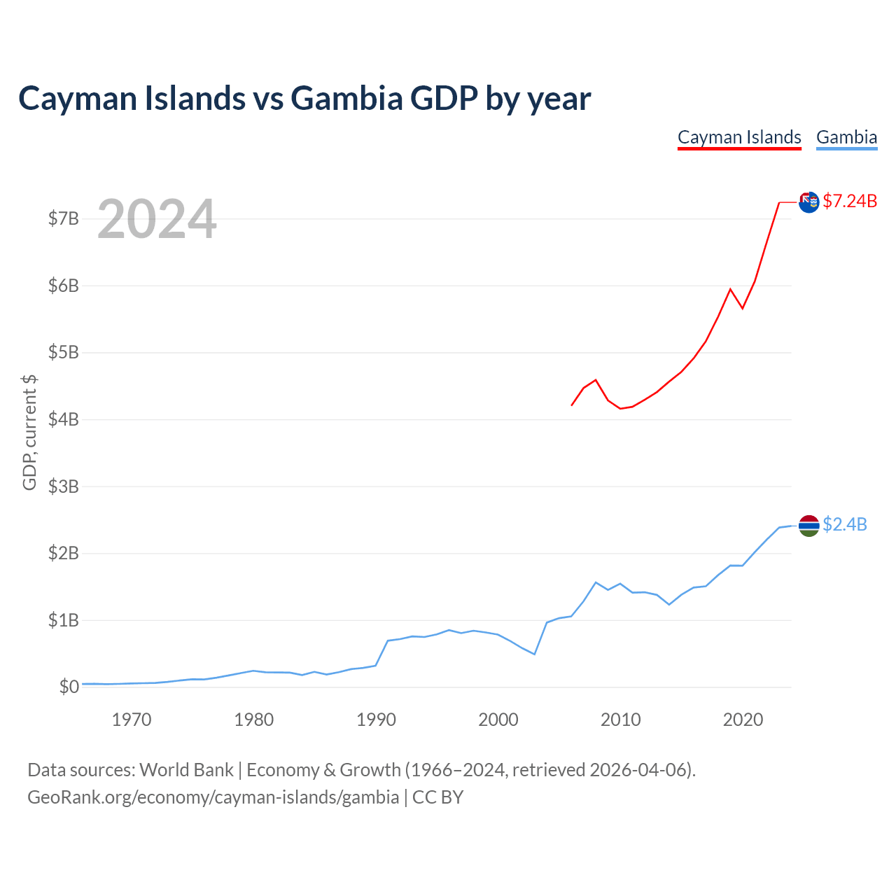 The Cayman Islands has a GDP of $7.24B compared to $2.4B for the Gambia, ranking 158/197 and 174/197 by economy size, respectively.